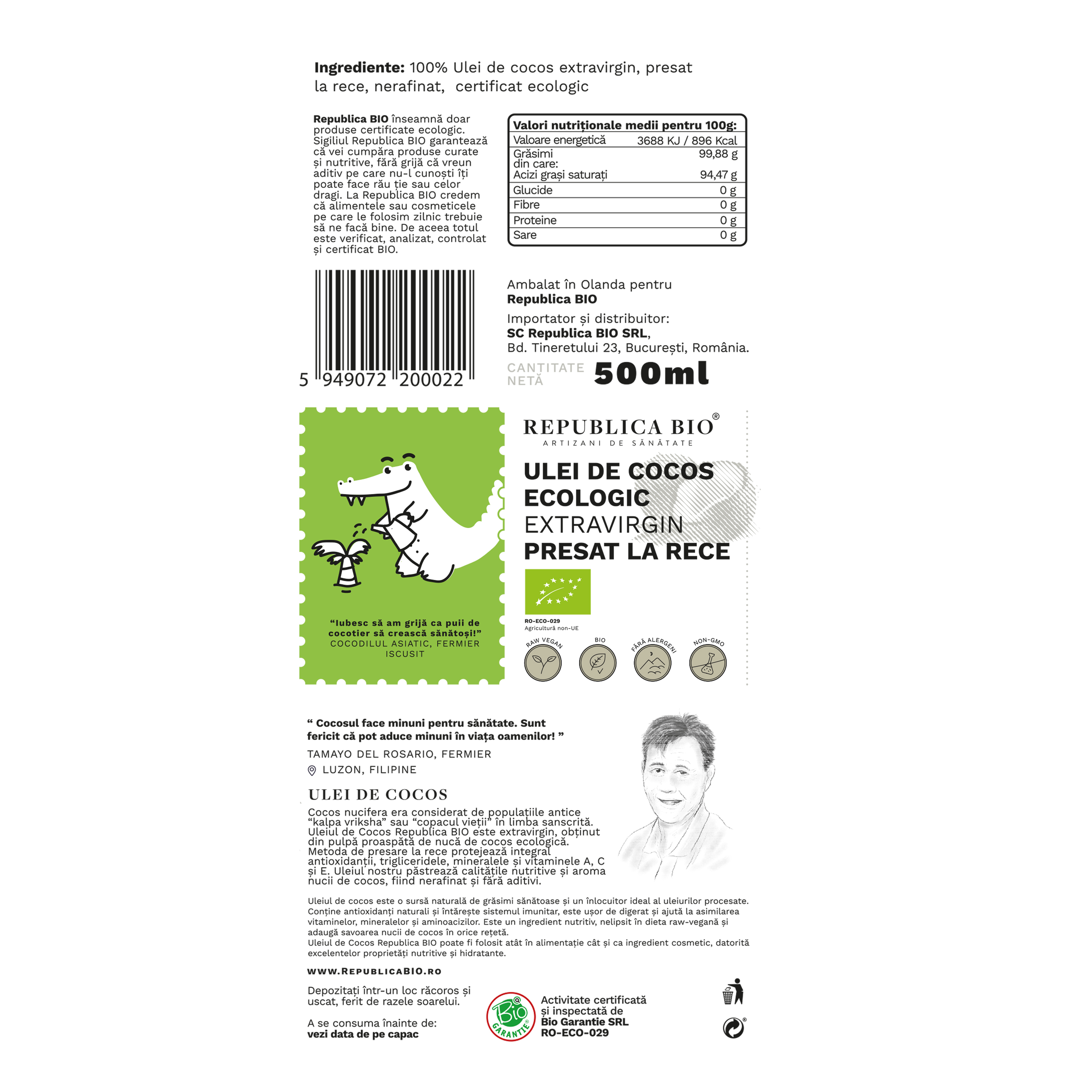 Uleiul de cocos Republica Bio este extravirgin, presat la rece din pulpă proaspătă de nucă de cocos provenită din agricultură ecologică. Produsul este nerafinat, neînălbit, neaditivat și neîncălzit, obținut prin centrifugare, presare la rece și filtrare atentă, pentru a păstra aroma și caracteristicile naturale ale cocosului. Este un ingredient versatil, utilizat atât în alimentație, cât și în rețete cosmetice realizate acasă.