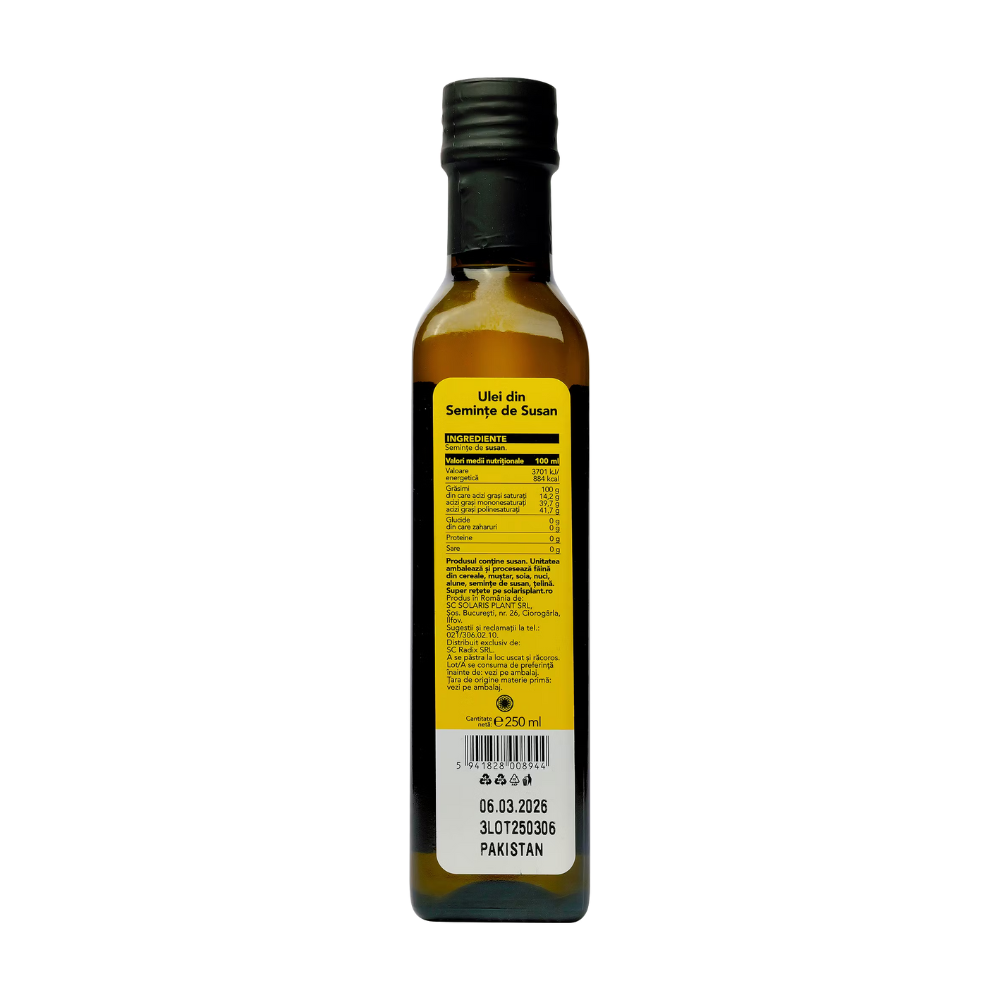 Ulei de susan obtinut prin presare la rece in presa Solaris, filtrat natural prin bumbac si pastrat la standarde inalte de calitate. Bogat in antioxidanti, Omega 6 si Omega 9, vitaminele E si K, acest ulei vegetal este un ingredient versatil pentru alimentatie sanatoasa si ingrijirea pielii. Stabil la temperatura camerei si rezistent la oxidare, cu punct de ardere de 177°C.
