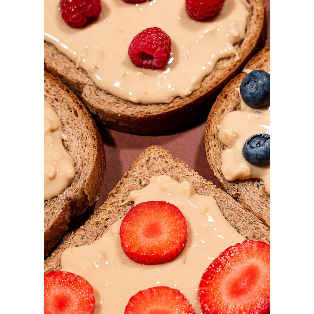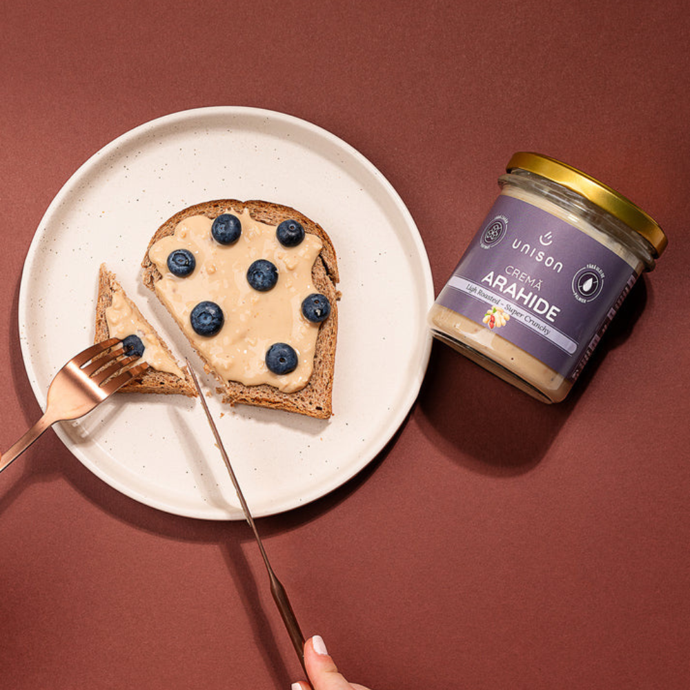 Cremă de arahide natural crunchy. Produs prin coacerea ușoară a arahidelor (light roast) pentru a păstra un gust unic și o consistenţă crunchy. Conţinut bogat de proteine: 22.49g / 100g