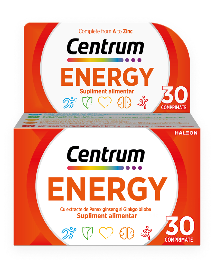 Vitamina E 27 mg (223%*); Vitamina C 120 mg (150%*); Vitamina K 25 µg (33%*); Vitamina B1 4,2 mg (382%*); Vitamina B2 4,8 mg (343%*); Vitamina B6 6 mg (429%*); Vitamina B12 18 µg (720%*); Vitamina D3 5 µg (100%*); Biotina 40 µg (80%*); Acid folic 400 µg (200%*); Niacină 36 mg (225%*); Acid pantotenic 10 mg (167%*); Fier 14 mg (100%*); Iod 150 µg (100%*); Cupru 0,7 mg (70%*); Mangan 1,8 mg (90%*); Crom 120 µg (300%*); Molibden 75 µg (150%*); Seleniu 70 µg (127%*); Zinc 7,5 mg (75%*); Extract de Ginkgo biloba 60 mg; Extract de Panax ginseng 50 mg; Extract de Ginkgo biloba 60 mg**; Extract de Panax ginseng 50 mg**. *din valoarea nutrițională de referință
