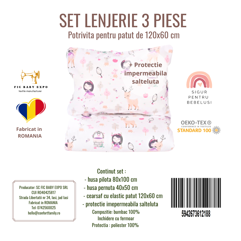Descoperă setul Fic Baby – Lenjerie 3 piese + protecție impermeabilă, pentru fetițe, creat pentru confortul și somnul liniștit al bebelușului tău. Potrivit pentru pătuțurile de 120x60 cm, setul este confecționat din bumbac 100% moale, plăcut la atingere, ce permite pielii delicate a copilului să respire. Include o protecție impermeabilă practică, care prelungește durata de viață a saltelei, menținând-o curată și uscată. Designul cu detalii fine și imprimeuri delicate îl face ideal pentru camera oricărei fetițe.