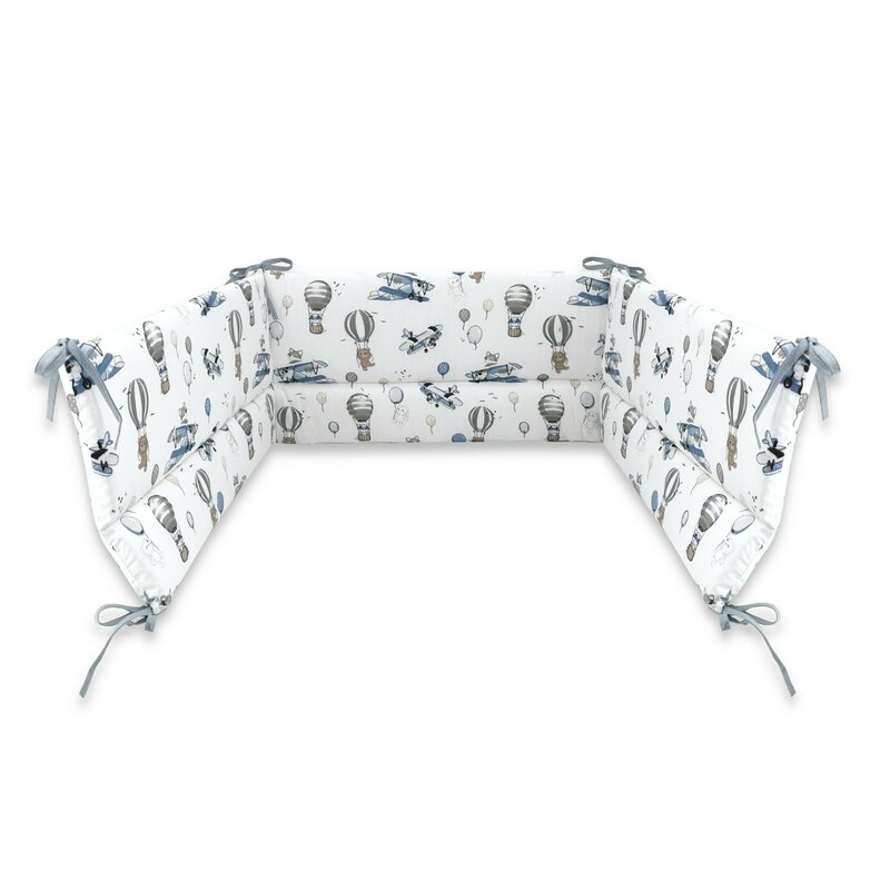 Transformă pătuțul copilului într-un spațiu sigur și confortabil cu Lenjeria de pat 3 piese MimiNu Blue Plane, realizată din bumbac 100% natural certificat Oeko-Tex Standard 100. Setul include o husă pentru pilotă (135x100 cm), o apărătoare laterală cu husă din bumbac (180x30 cm), care acoperă jumătate din lungimea unui pătuț de 120x60 cm, și o husă de pernă (40x60 cm). Materialele sunt moi, plăcute la atingere și durabile, oferind un mediu sigur pentru somnul copilului. Umplutura apărătorii laterale este realizată din poliester siliconic antialergic, asigurând o protecție optimă împotriva loviturilor. Produsul este hipoalergenic, sigur pentru pielea sensibilă a bebelușilor și fabricat manual în Polonia.