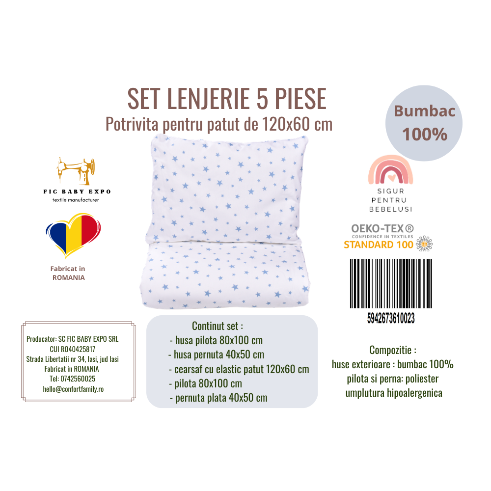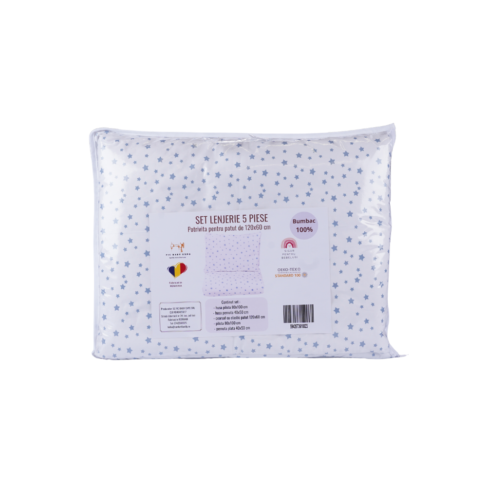 Lenjeria pentru pătuț este realizată din bumbac 100%, moale, dens și foarte plăcut la atingere, oferind confort și un mediu delicat pentru somnul bebelușului încă din primele zile de viață.