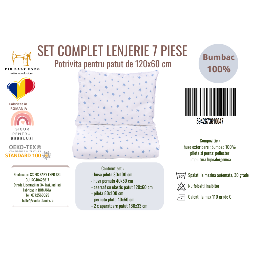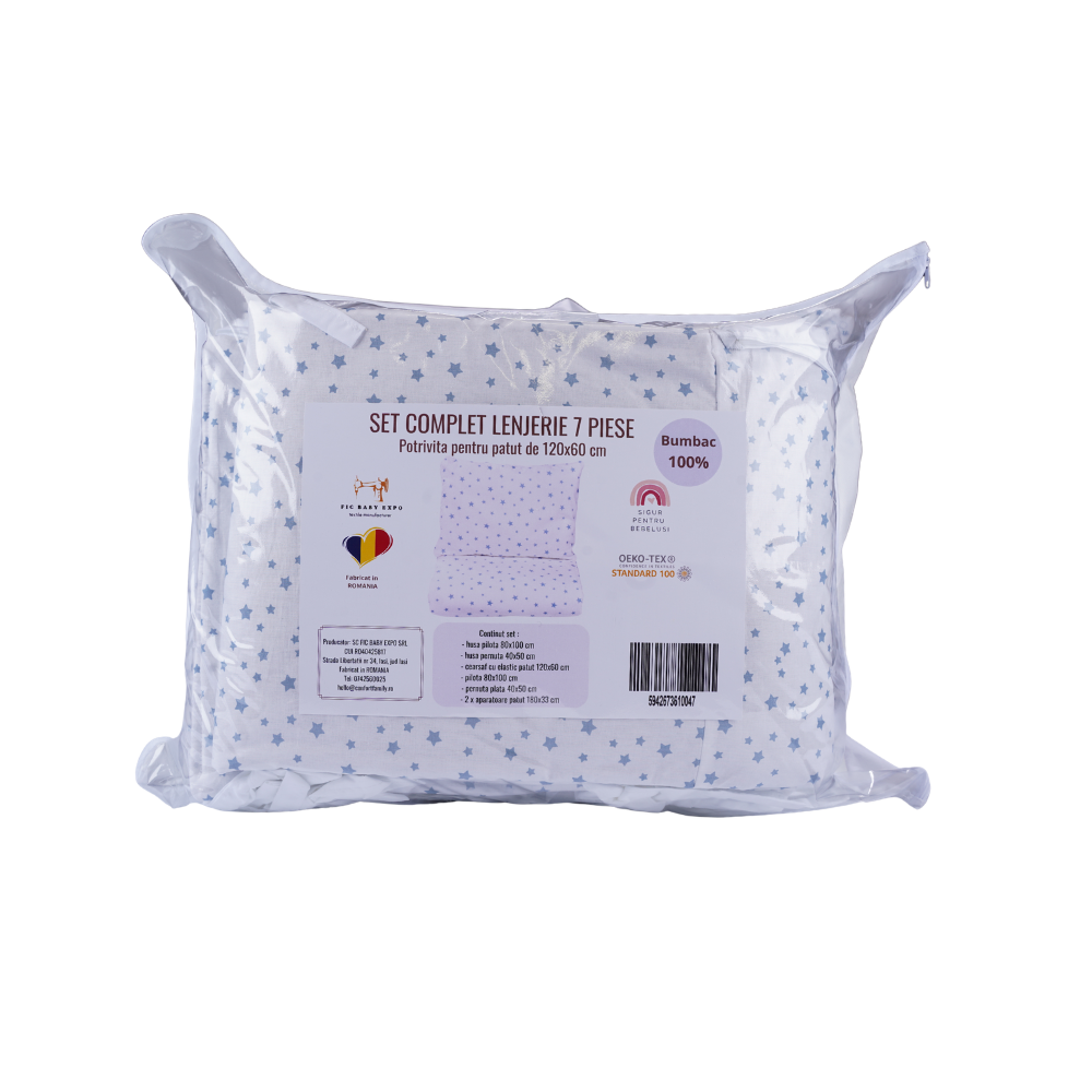Lenjeria este realizată din bumbac 100% moale, dens și foarte plăcut la atingere, oferind confort și siguranță bebelușului încă din primele zile de viață.