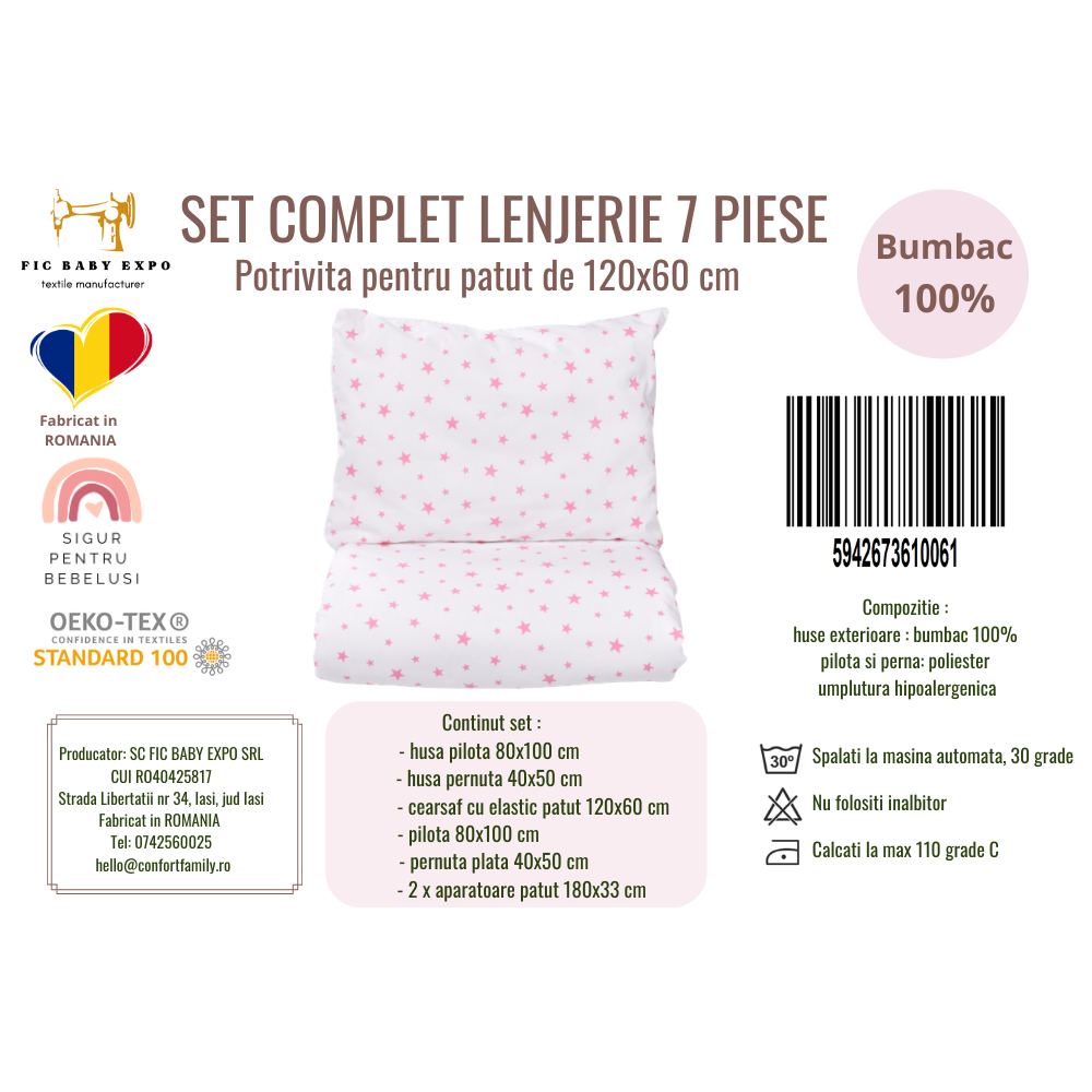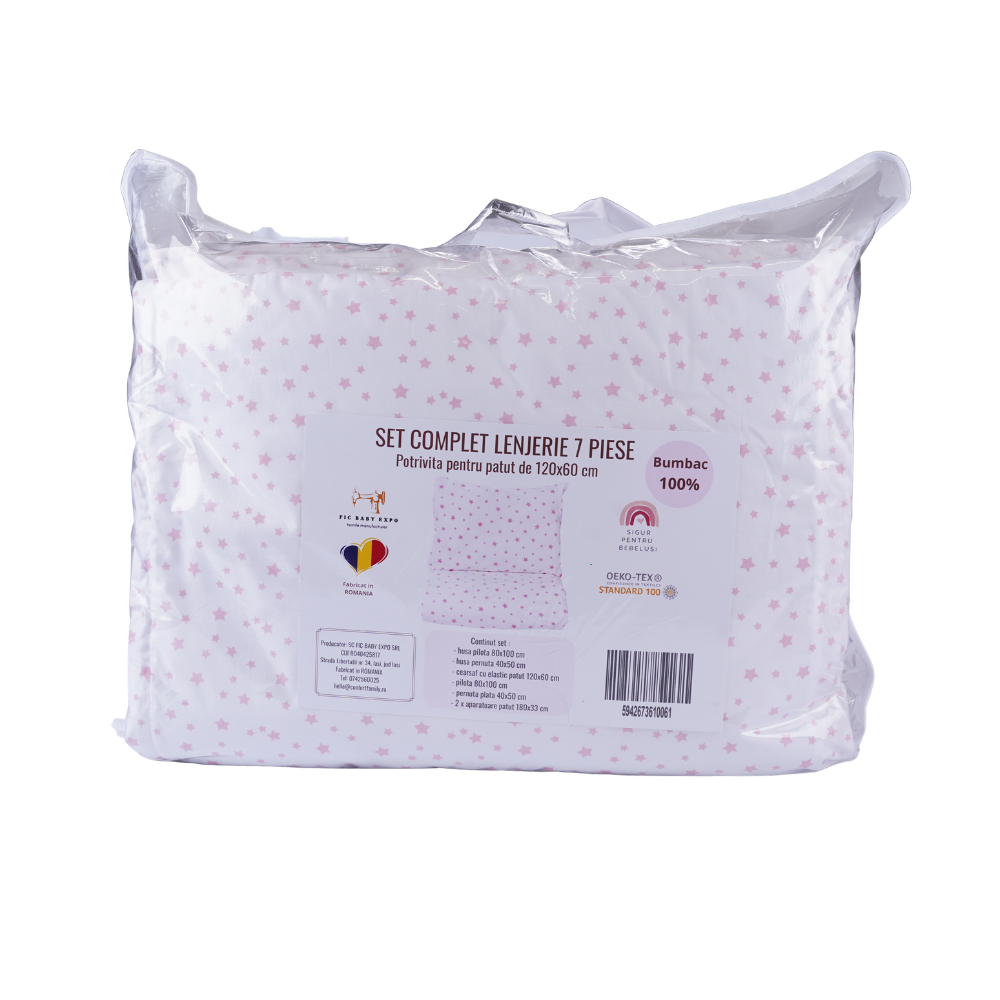 Lenjeria este realizată din bumbac 100% moale, dens și foarte plăcut la atingere, asigurând confort și siguranță pentru bebeluși încă de la naștere.