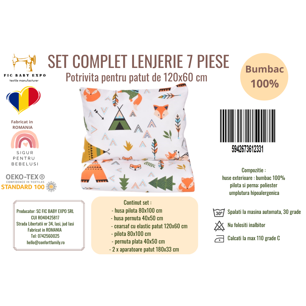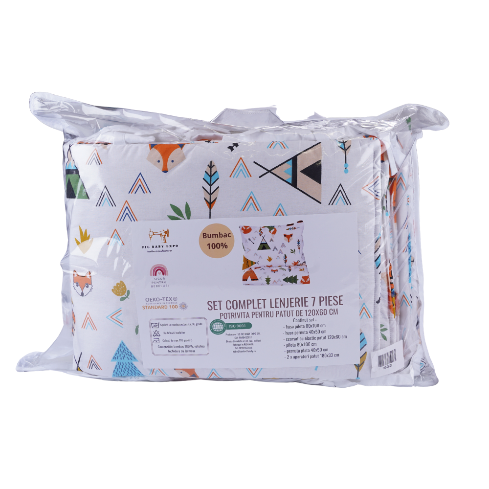 Set complet de lenjerie pentru pătuț, realizat din bumbac 100% moale, ideal pentru somnul confortabil al bebelușului. Include toate piesele necesare pentru un pat sigur, igienic și plăcut, cu un design simpatic cu animaluțe.