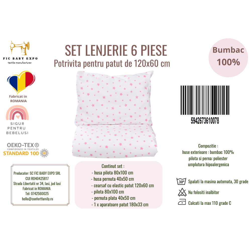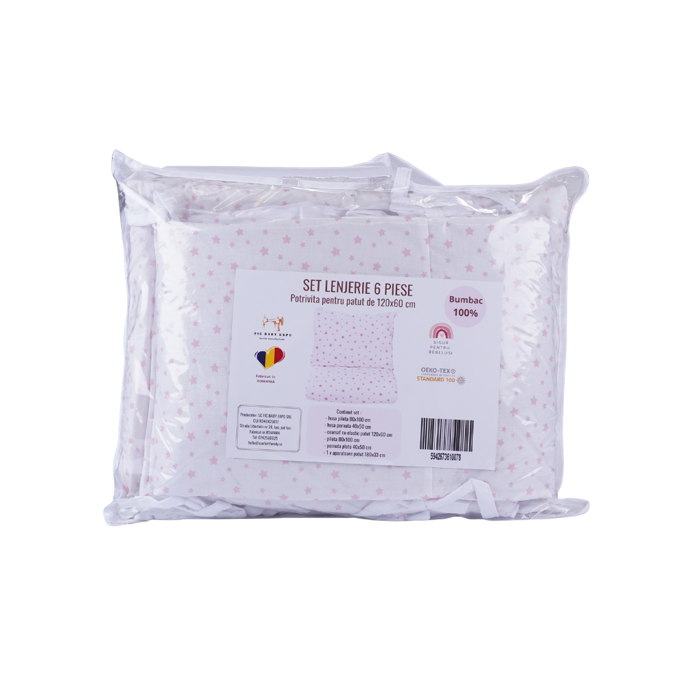 - Setul este potrivit pentru patut de 120x60 cm, cu o salteluta ce are inaltimea de maxim 10 cm.
