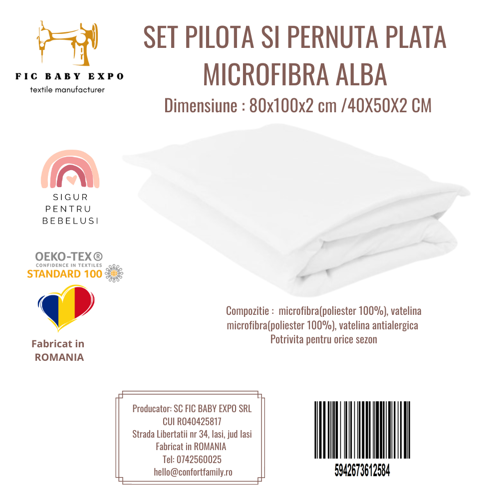 Setul contine o pilota cu dimensiunea de 100x80 cm, realizata din microfibra la exterior si vatelina hipoalergenica la interior.