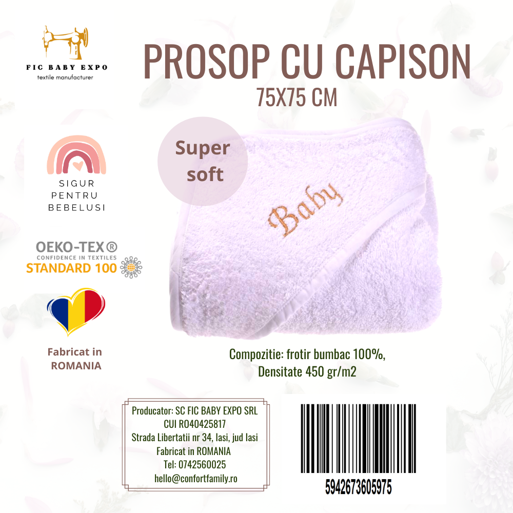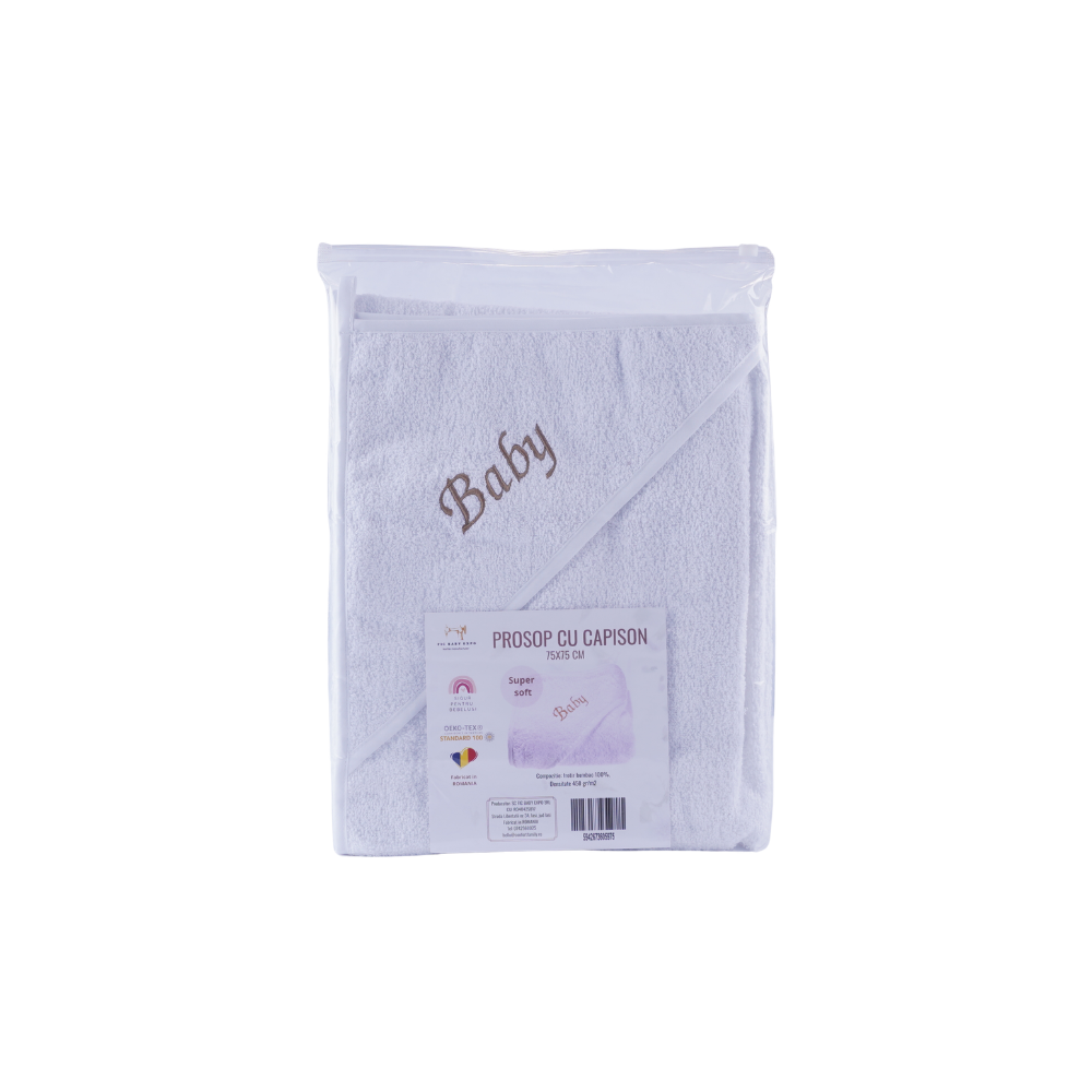 Prosopul este realizat din bumbac 100%, moale si pufos, ce absoarbe apa in mod eficient si este bland cu pielea celor mici.