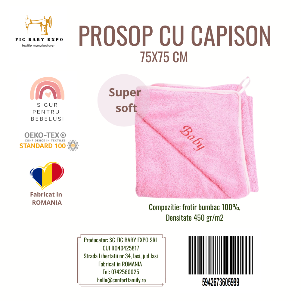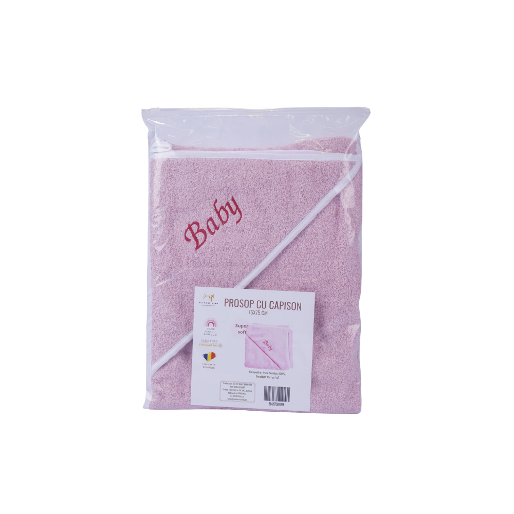 Prosopul este realizat din bumbac 100%, moale și pufos, fiind delicat cu pielea sensibilă a bebelușilor. Materialul absoarbe eficient apa și oferă confort după fiecare băiță.