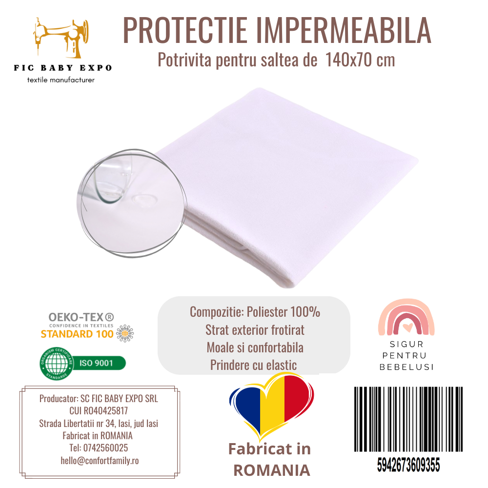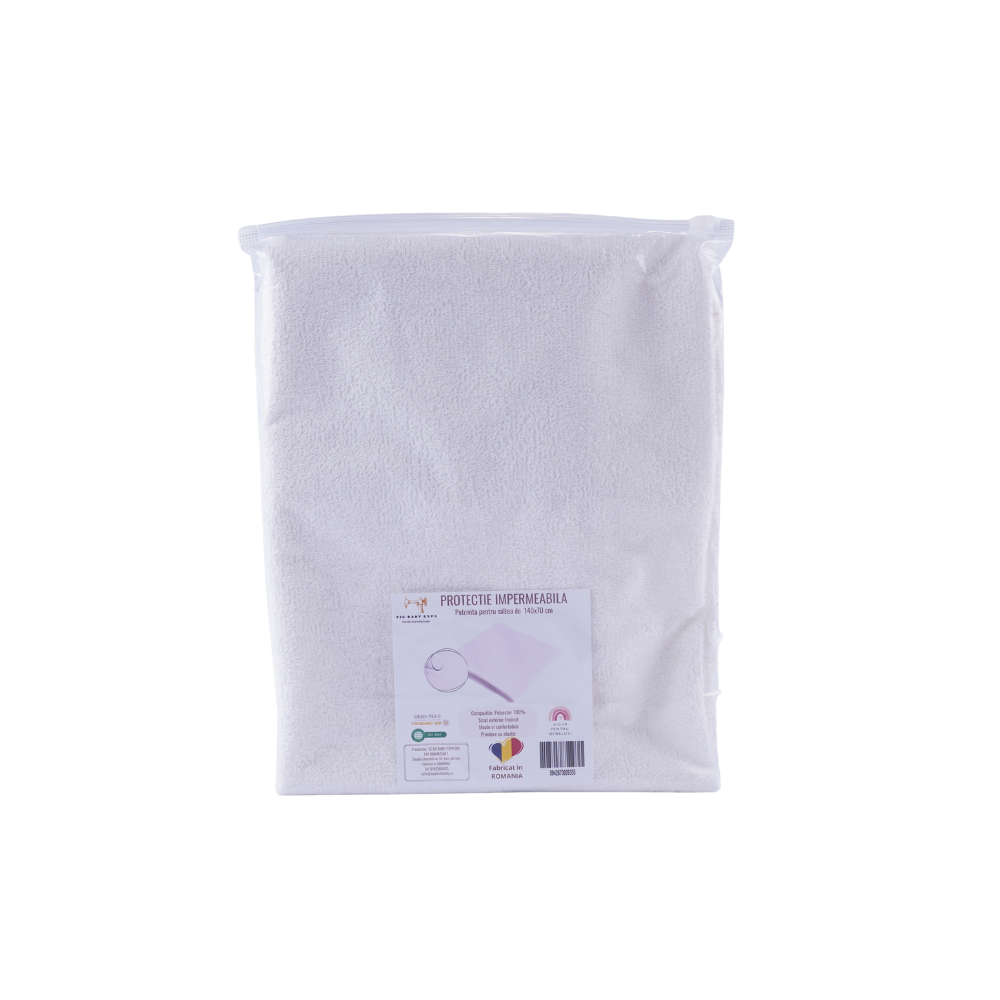 Este realizata pe o parte cu un strat impermeabil 100%, iar pe deasupra protectia contine un strat frotirat, ce ofera confort copilasului;