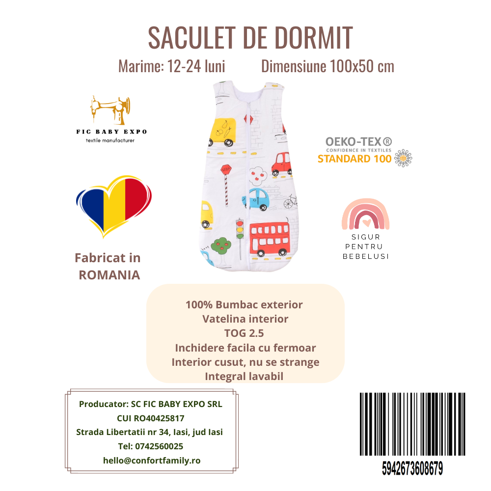SăculeÈ›ul de dormit este o alegere practică pentru somnul copiilor, contribuind la menÈ›inerea confortului pe durata nopÈ›ii È™i ajutând la prevenirea dezvelirii. Designul cu model de maÈ™inuÈ›e colorate este potrivit pentru camera celor mici, iar materialele sunt alese pentru a oferi o senzaÈ›ie plăcută la atingere.