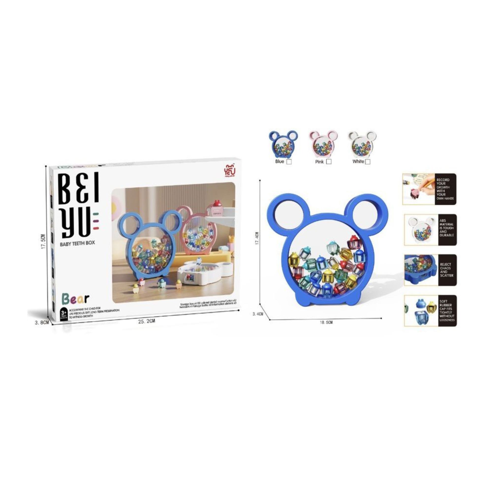 Păstrează într-un mod organizat și simpatic amintirile din copilărie cu această cutie pentru dinții de lapte, în formă de ursuleț. Produsul este conceput pentru depozitarea dinților de lapte ai copilului, transformând fiecare etapă de creștere într-o amintire frumoasă pentru familie.
