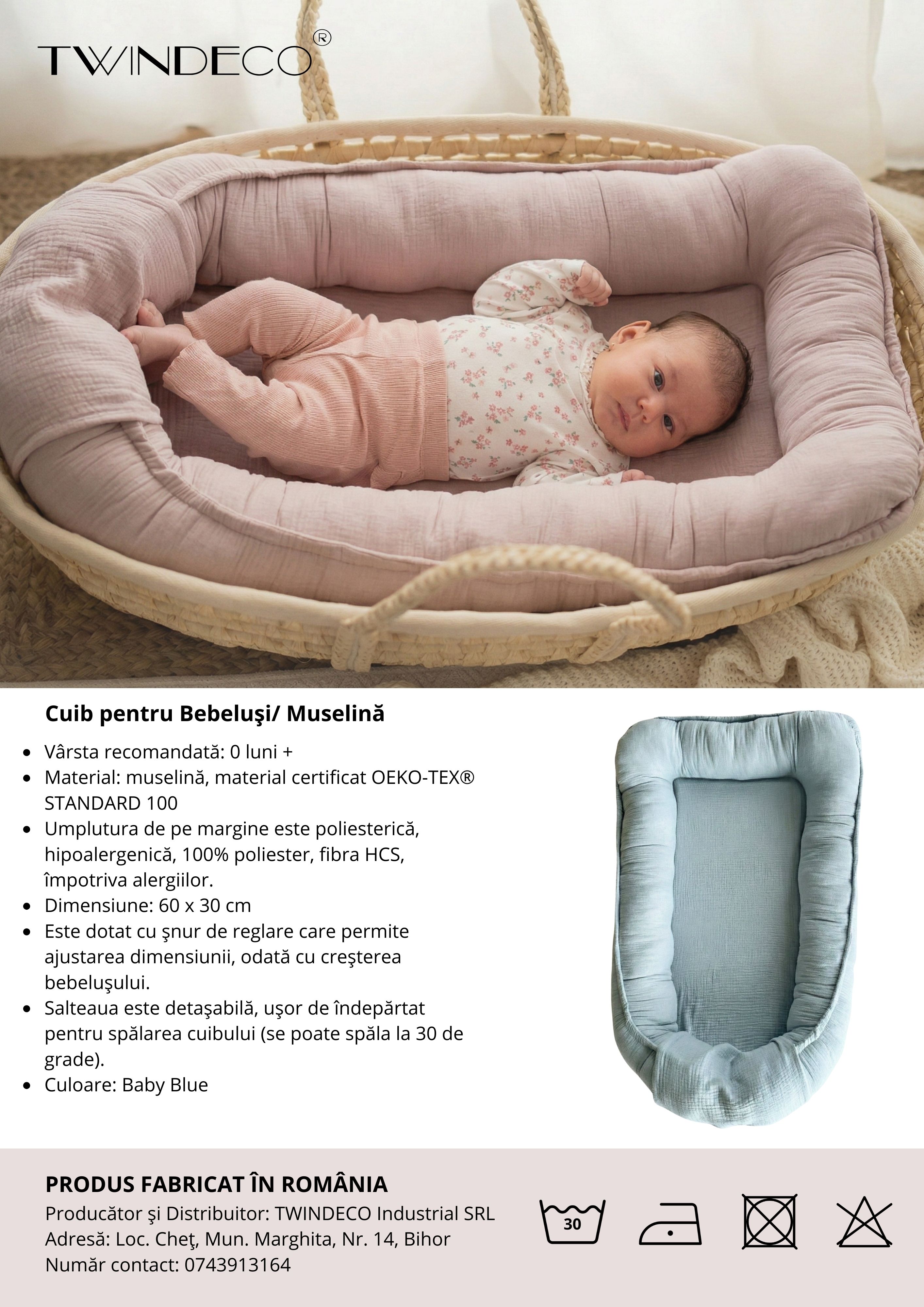 Produsul este confectionat din bumbac organic certificat GOTS si OEKO-TEX Standard 100, ceea ce confirma atentia acordata materialelor folosite si contactului direct cu pielea. Cuibul include o saltea din burete cu densitate mare si margini laterale cu umplutura antialergica, pentru un plus de confort si sustinere. Materialul ramane usor, absorbant si devine mai moale dupa spalari repetate.