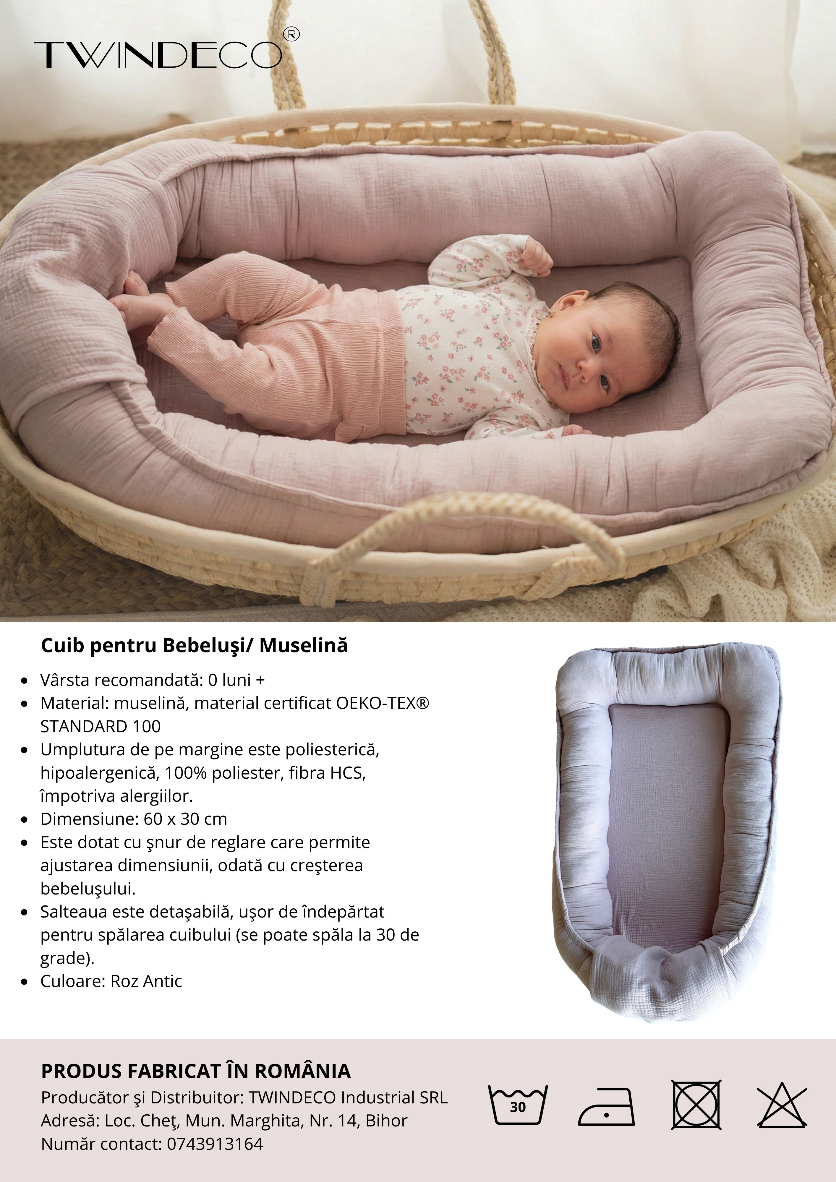 Cuib bebelusi din muselina este realizat din 100% muselina din bumbac organic, un material moale, respirabil si placut la atingere, potrivit pentru pielea sensibila a celui mic. Tesatura permite circulatia aerului si contribuie la mentinerea unui mediu confortabil in utilizarea zilnica, fiind potrivita inca din primele zile de viata ale bebelusului.