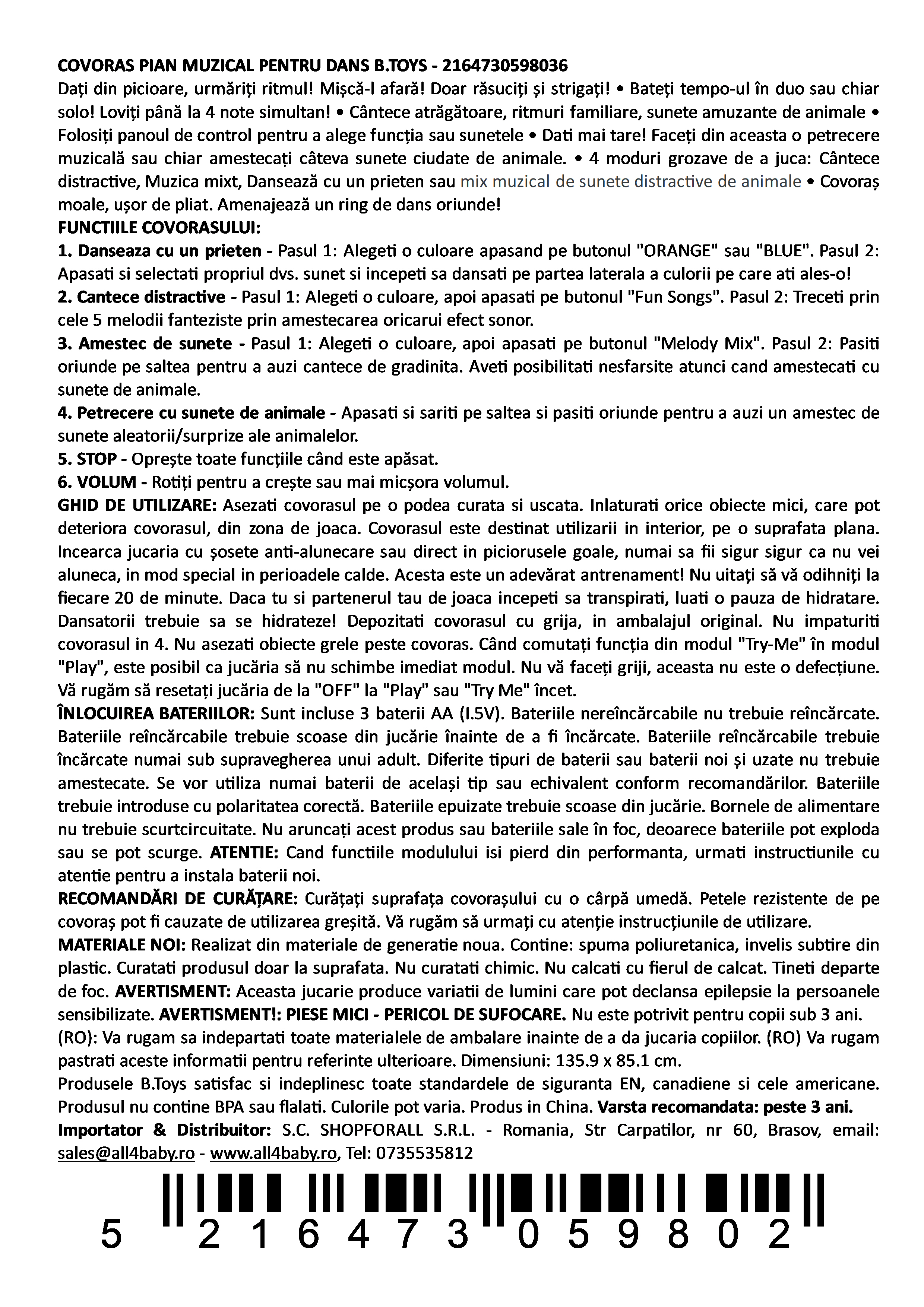 Ultima actualizare a informatiilor de prezentare pentru Covoras muzical pentru dans forma pian, 3 ani+, 135 x 85 cm, BToys a fost efectuata la data de 03-04-2026.