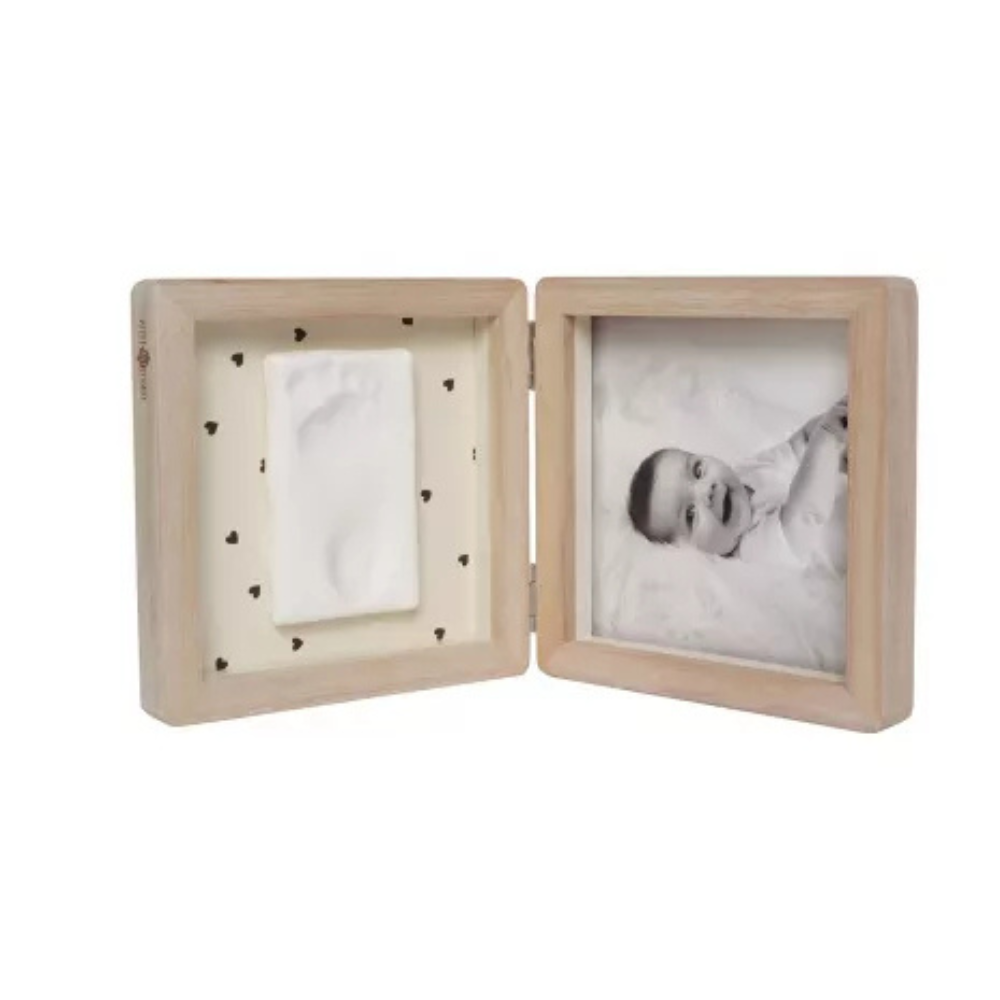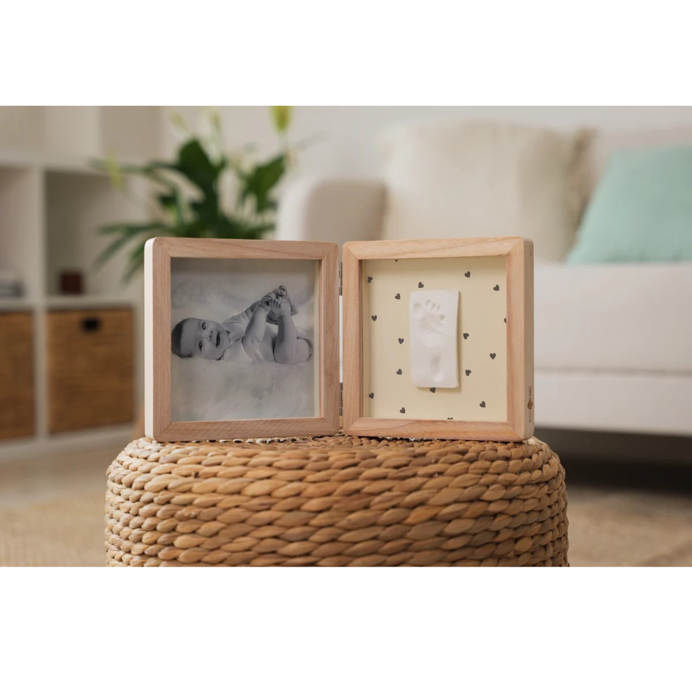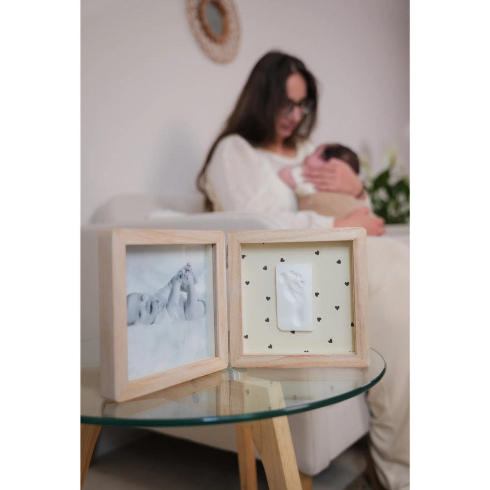 Ramă dublă din lemn cu două panouri: un spațiu pentru fotografie și un spațiu pentru amprentă.