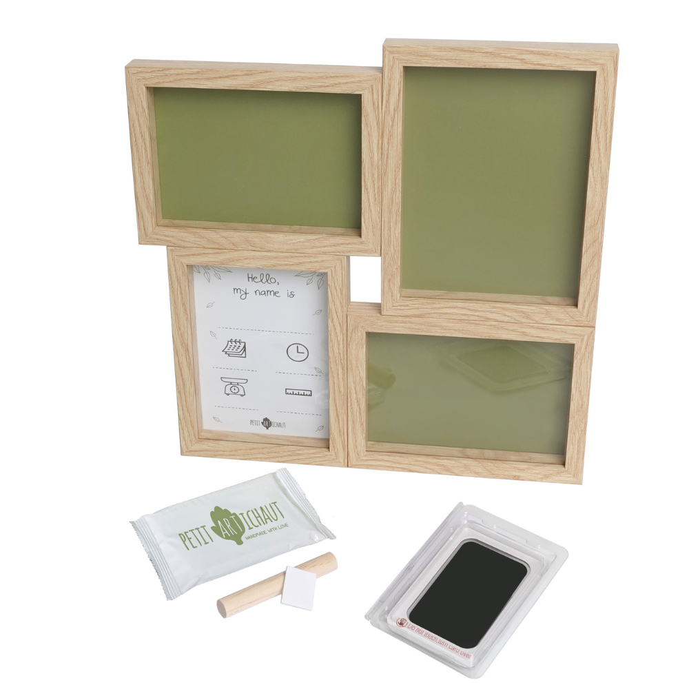 Rama foto cu Kit amprenta Puzzle – Olive Tree – Petit Artichaut este un set elegant si modern, conceput pentru a pastra cele mai pretioase amintiri din primele luni de viata ale bebelusului. Setul contine mai multe rame individuale pentru fotografie si amprente realizate din argila hipoalergenica si tus fara cerneala, oferind o modalitate sigura si curata de a crea amintiri durabile. Include postere multilingve pentru completarea datelor de nastere – nume, greutate, inaltime si ora venirii pe lume – transformand fiecare detaliu intr-o amintire unica. Designul contemporan, cu fundaluri personalizabile in verde masliniu sau model frunza, face din acest kit un cadou rafinat pentru botez sau baby shower.