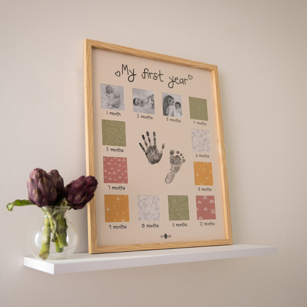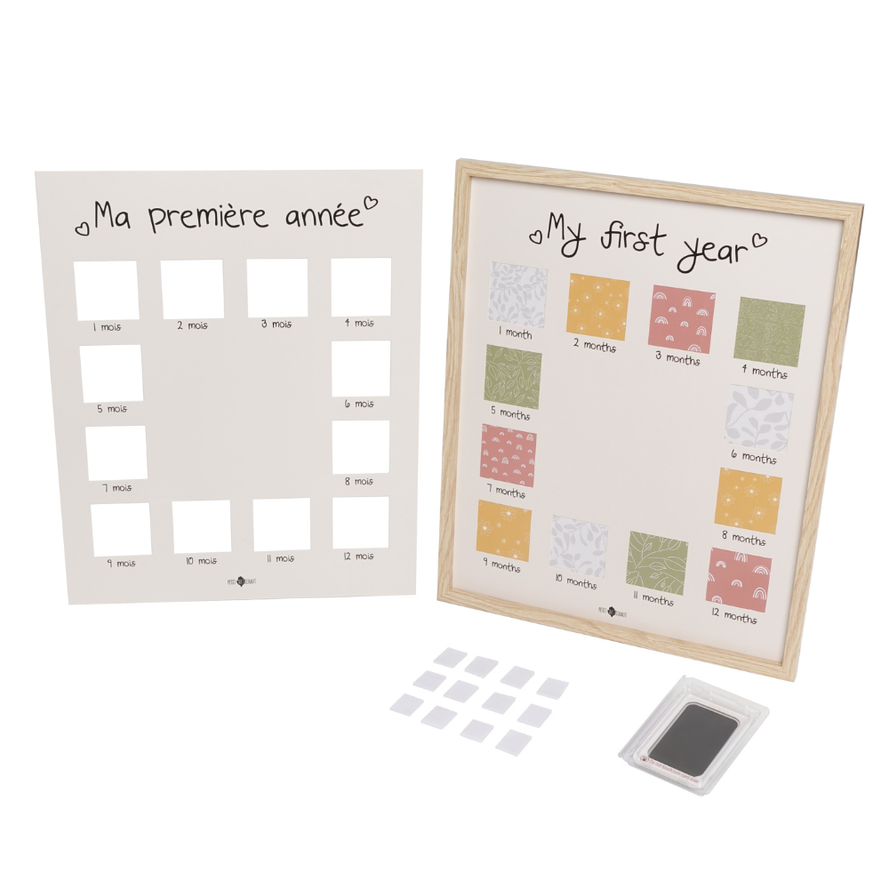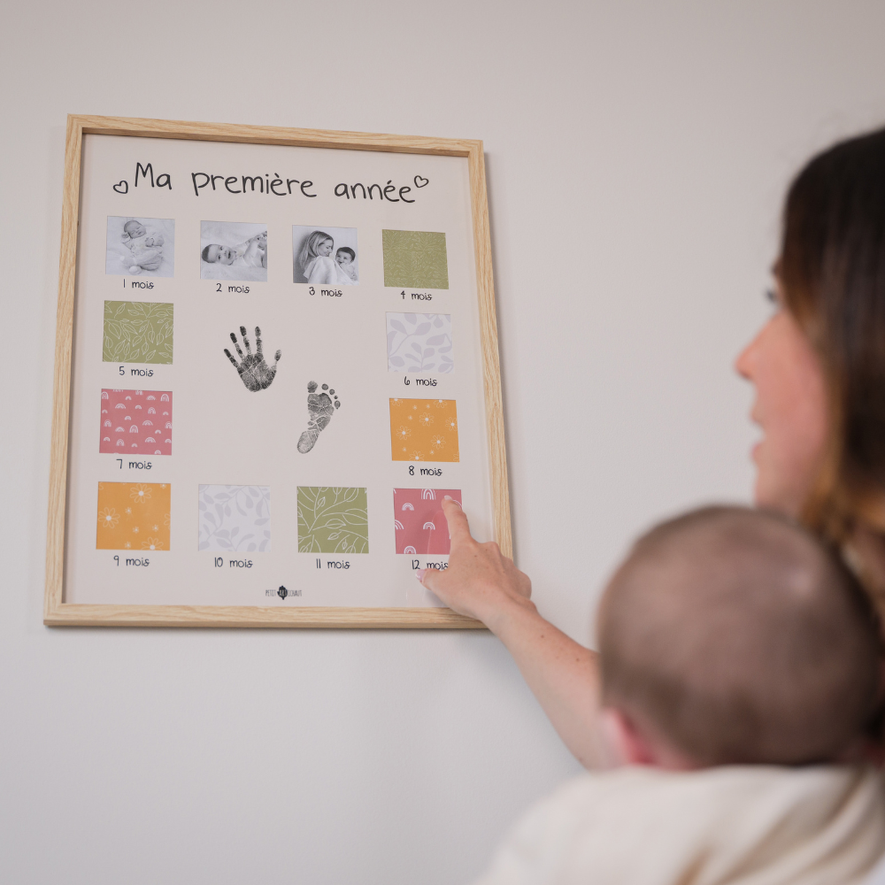 Descopera rama tablou cu kit amprenta My First Year Petit Artichaut, o modalitate eleganta si emotionanta de a pastra primele amintiri ale bebelusului tau. Conceputa pentru a urmari evolutia copilului in primul an de viata, aceasta rama include 12 spatii dedicate fiecarei luni si un loc central pentru amprenta mainii sau piciorusului. Datorita tehnologiei Smart Inkless Touch, imprimarea este sigura si fara contact direct cu cerneala. Designul modern si finisajul din lemn natural transforma rama intr-o decoratiune speciala pentru camera bebelusului, fiind in acelasi timp un cadou ideal pentru nastere sau baby shower.