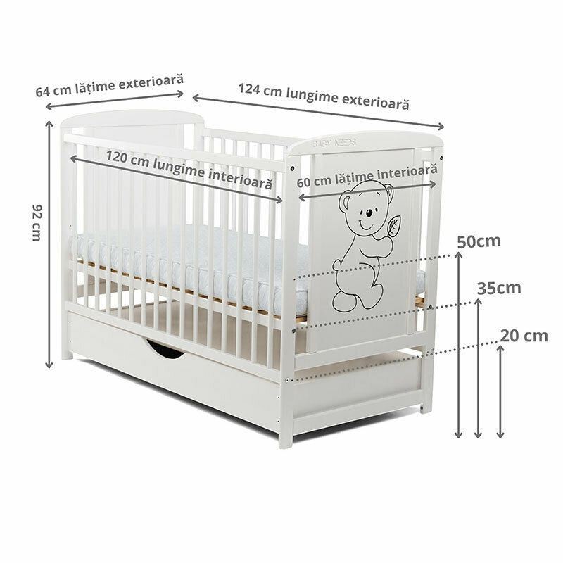 Patul pentru bebeluși BabyNeeds Timmi este o alegere practică și sigură pentru părinții care își doresc un spațiu confortabil și durabil pentru copilul lor. Realizat din lemn masiv de pin și MDF, patul oferă stabilitate și rezistență pe termen lung, fiind potrivit de la naștere până la aproximativ 4 ani. Designul clasic, finisajul alb și atenția la detalii îl fac ușor de integrat în orice tip de cameră.