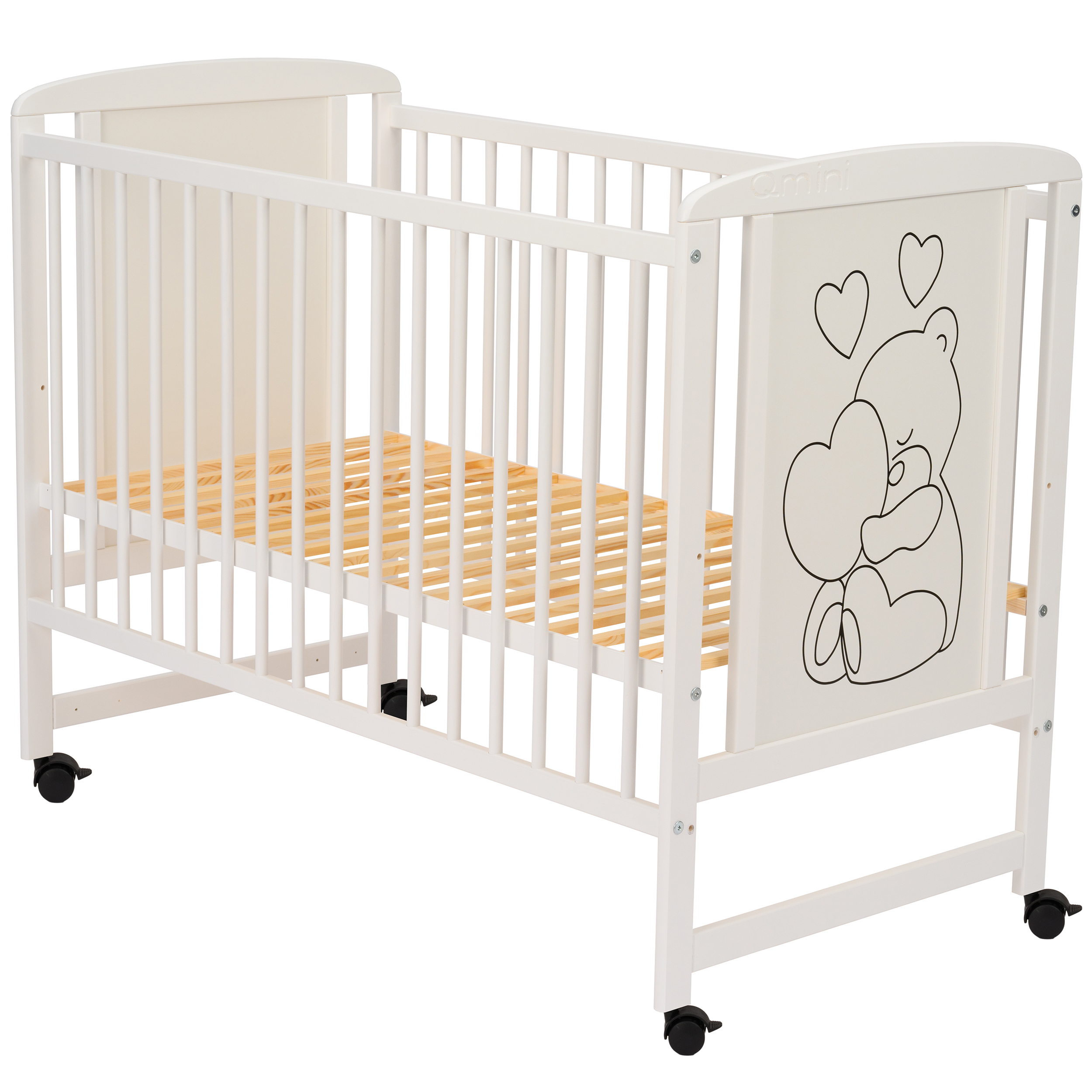 Pătuțul Timmi Heart de la Qmini îmbină designul clasic cu funcționalitatea modernă, oferind un spațiu sigur și confortabil pentru somnul bebelușului încă de la naștere până la vârsta de aproximativ 4 ani.