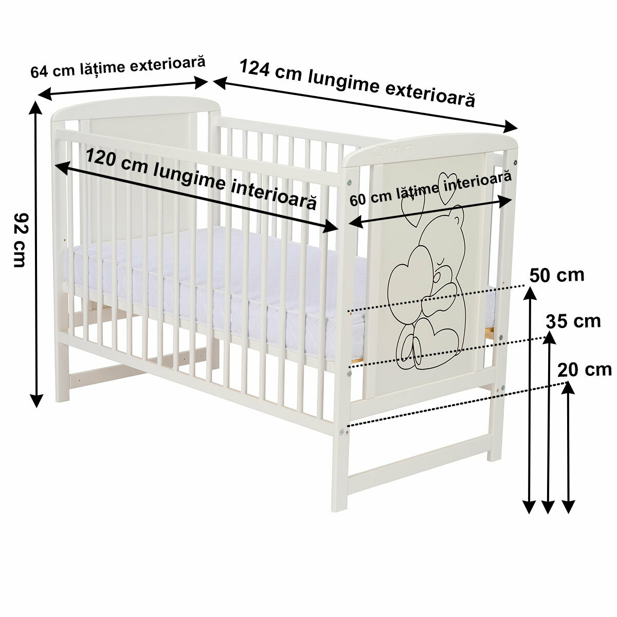 - Saltea recomandată: 120 × 60 cm (nu este inclusă)