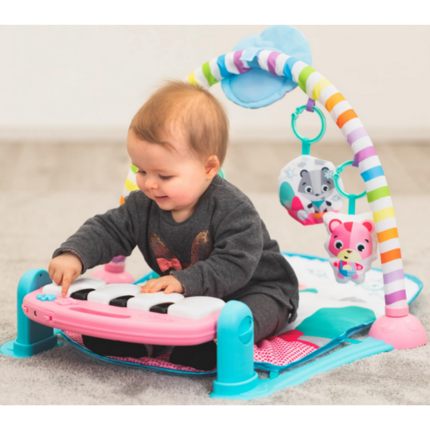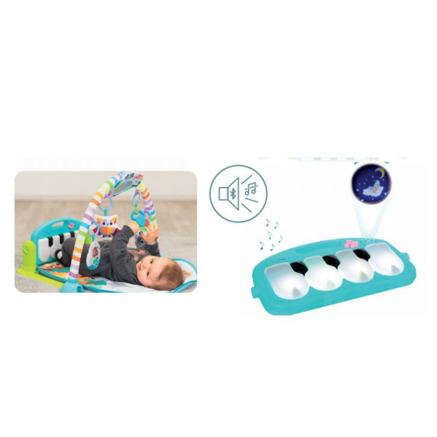 Acest covoraș interactiv este echipat cu un pian muzical integrat, care poate fi utilizat atât pentru a încuraja mișcările picioarelor bebelușului în timpul perioadei de „tummy time”, cât și pentru a-l încuraja să apese pe taste pe măsură ce crește. Designul său vibrant și culorile atractive sunt concepute pentru a stimula simțul vizual al copilului.