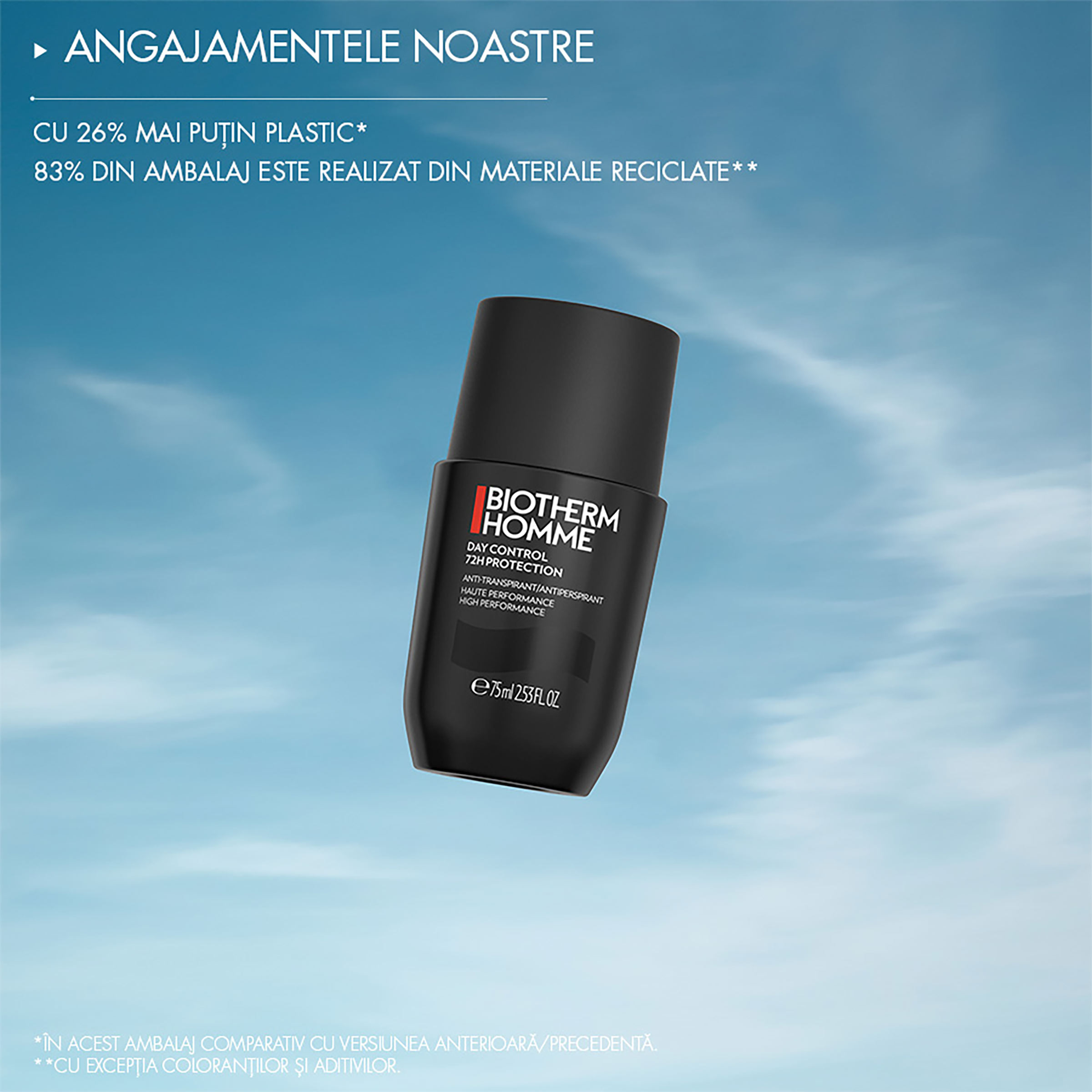 Deodorant roll-on barbati 72h Biotherm Homme Day Control ofera protectie de lunga durata impotriva transpiratiei cauzate de efort sau stres. Se usuca rapid, fara senzatie lipicioasa, mentinand axilele proaspete si confortabile pe parcursul a pana la 72 de ore.