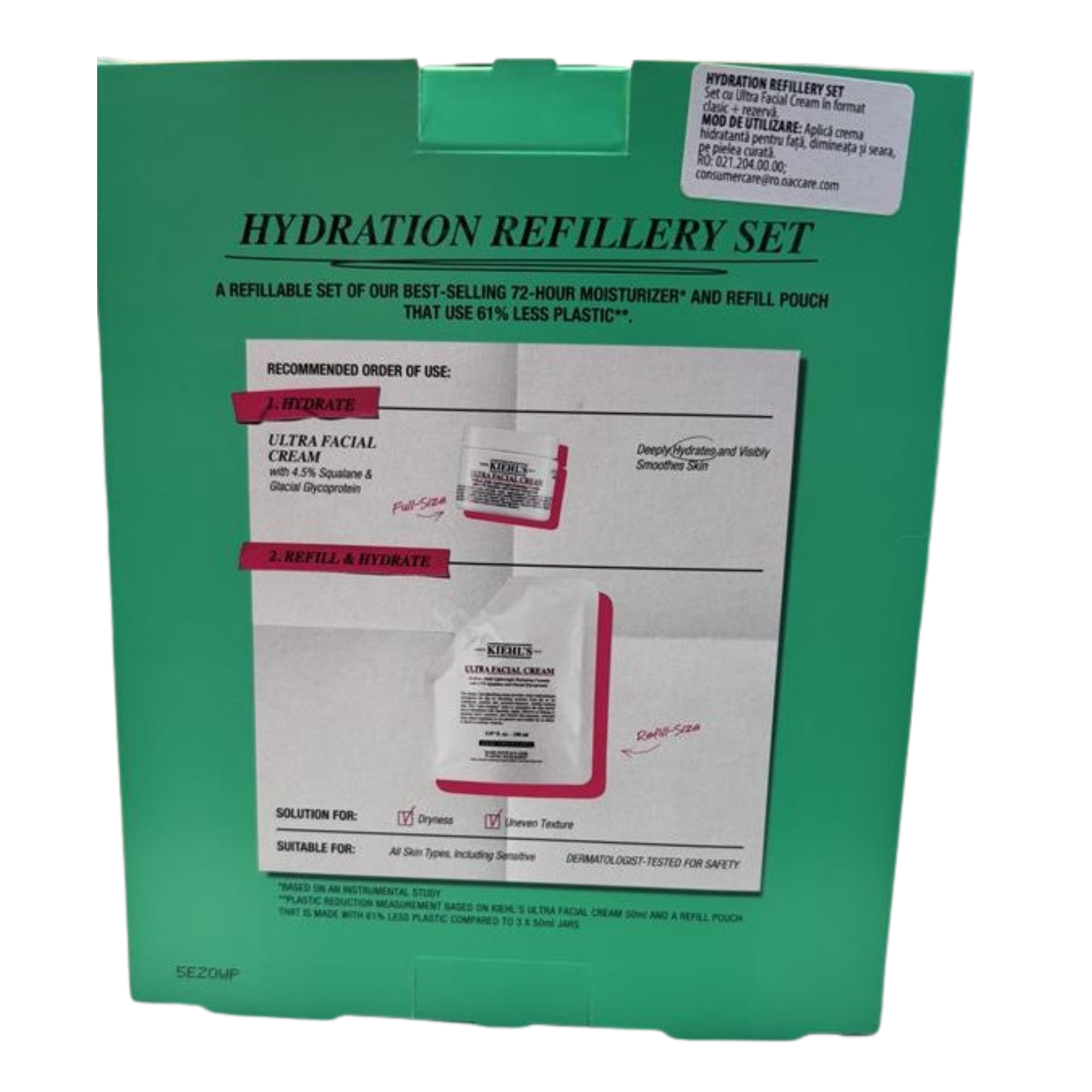 Set Hydration Refillery, Crema hidratanta Ultra Facial 50ml + rezerva 150ml, Kiehl's este solutia completa pentru hidratare intensa si de lunga durata, conceputa pentru a mentine pielea neteda, echilibrata si protejata zilnic.