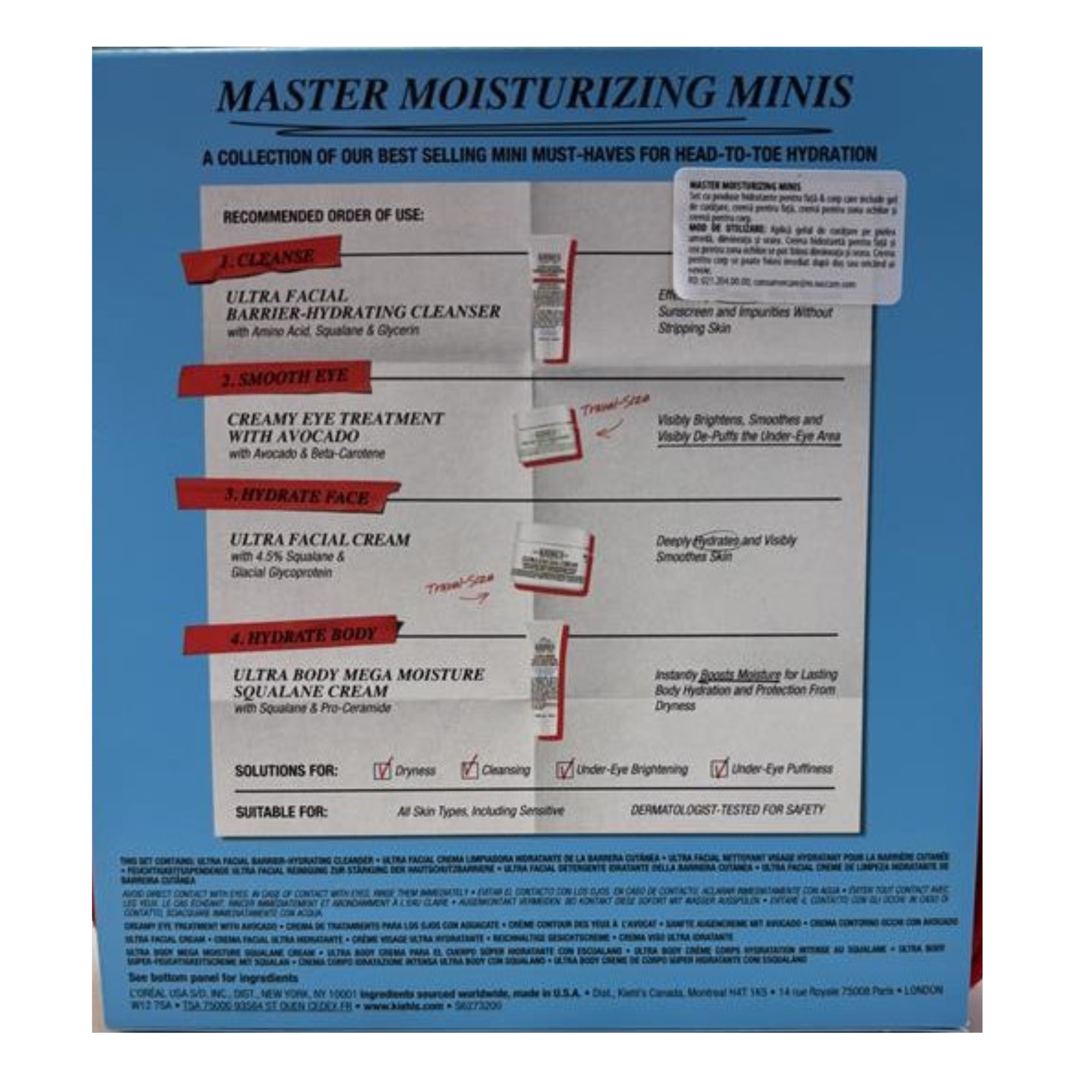 Set Master Moisturizing Mini Kiehl's este un kit complet pentru hidratarea intensa a pielii, conceput pentru ingrijirea fetei, zonei ochilor si corpului. Include produse esentiale care curata delicat, hranesc si sustin bariera naturala a pielii, oferind confort si suplete de la prima utilizare.