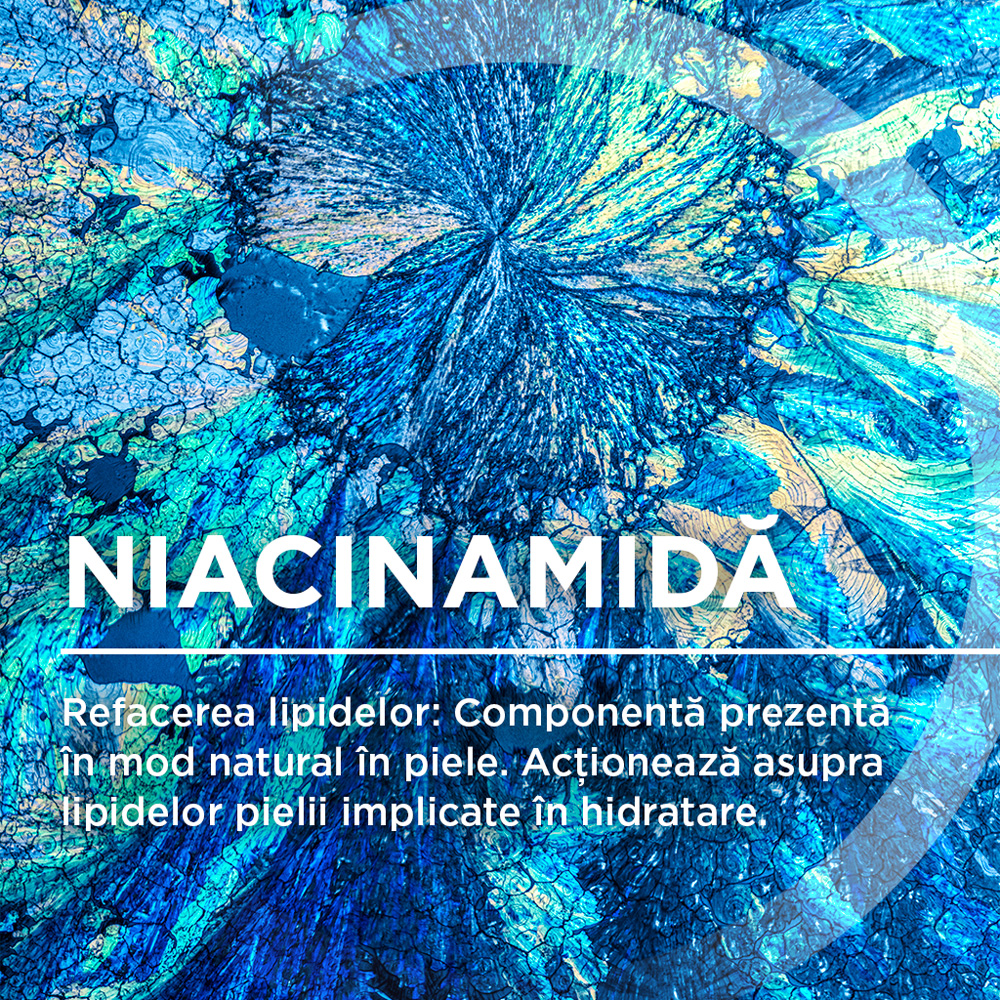 Datorita vitaminei PP, restaureaza productia de lipide si intareste bariera cutanata a pielii in mod durabil. Formulat pe baza unui derivat de Enoxolona, calmeaza senzatia de mancarime si pruritul. Complexul brevetat Skin Barrier Therapy™ limiteaza adeziunea si proliferarea Stafilococului Auriu, factor ce agraveaza uscaciunea. Se absoarbe rapid in piele si permite imbracarea imediat dupa aplicare.