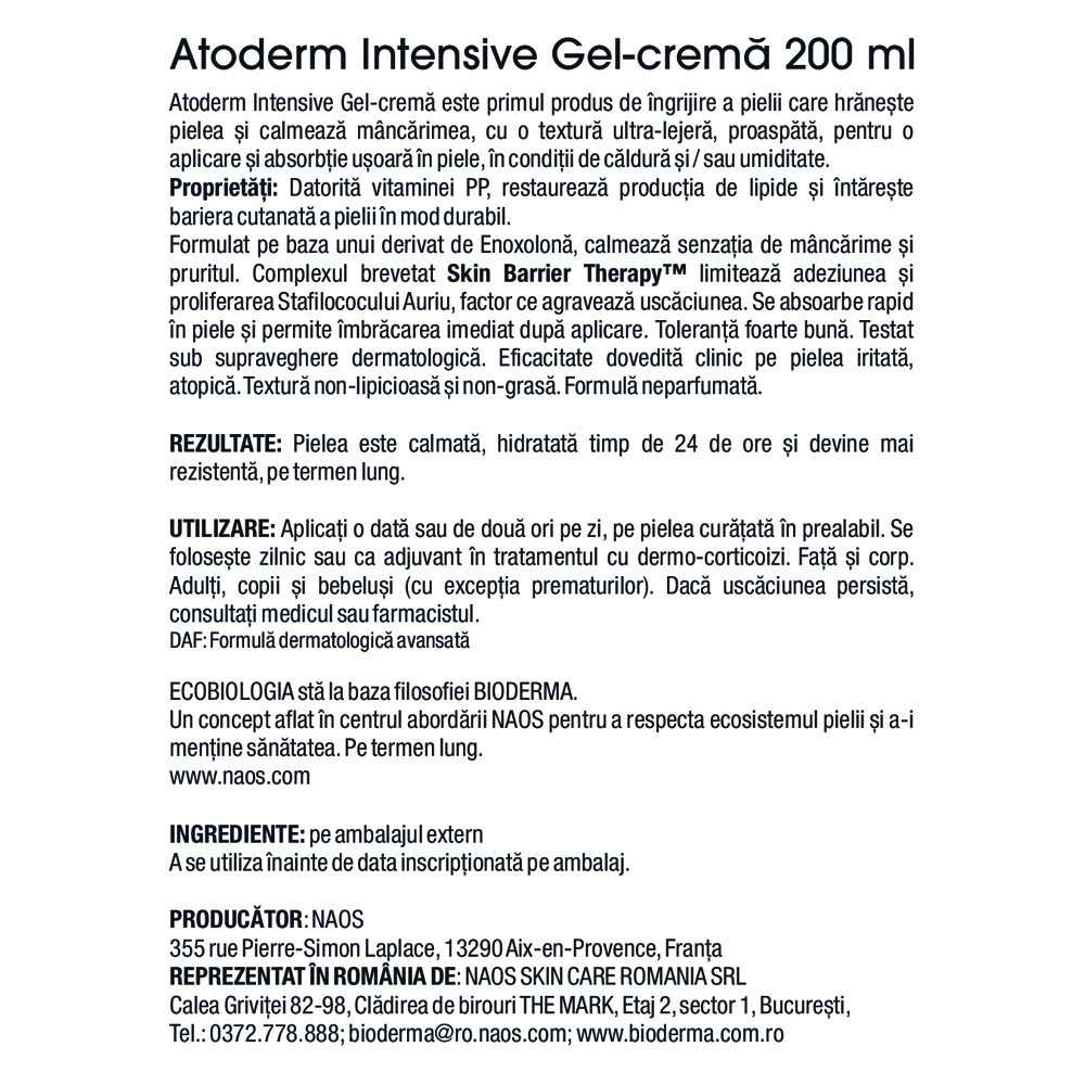 Caldura si / sau umiditatea pot face ca aplicarea zilnica a unui produs de ingrijire a pielii cu textura bogata pe pielea uscata cu tendinta atopica, sa fie neplacuta. Atoderm Intensive Gel-crema este primul produs de ingrijire creat pentru aceste conditii, care hraneste pielea si calmeaza mancarimea, cu o textura ultra-lejera, proaspata, pentru o aplicare si absorbtie usoara in piele.