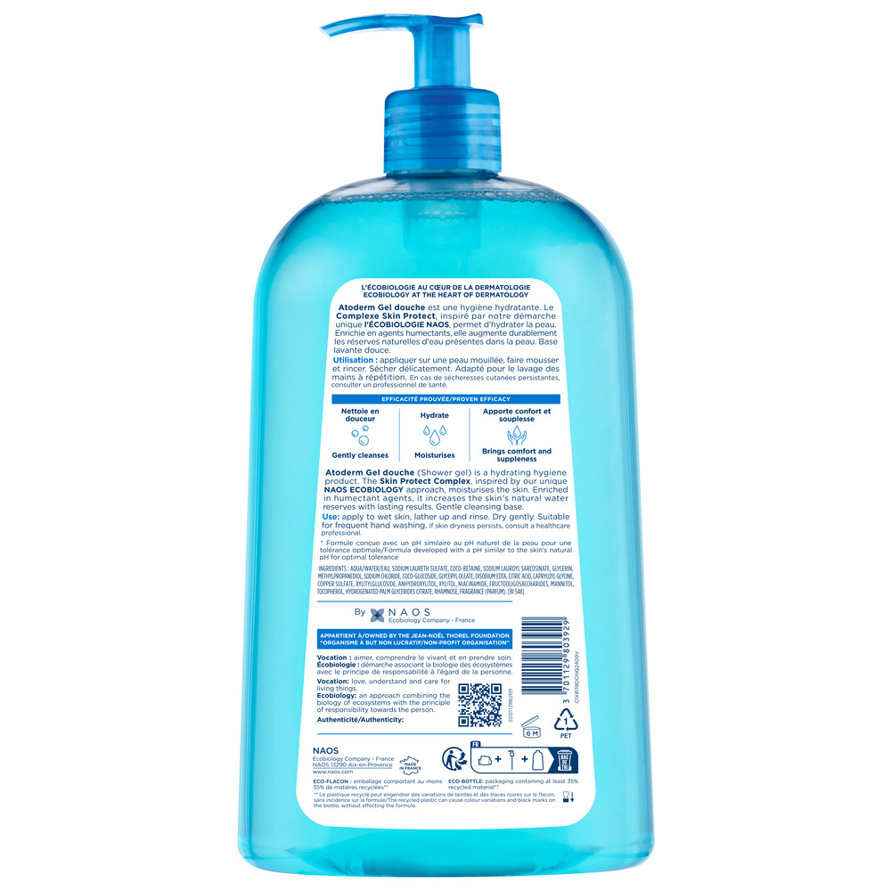 Atoderm Gel de duş este un gel de duş dermatologic pentru faţă, corp şi mâini, dedicat pielii normale, uscate, sensibile sau cu dermatită atopică. Formula respectă microbiomul şi pH‑ul fiziologic al pielii, curăţând delicat fără săpun sau alergeni. Complexul patentat Skin Protect™ stimulează producţia de acid hialuronic şi restabileşte lipidele, în timp ce brevetul D.A.F.™ creşte toleranţa pielii, oferind hidratare imediată şi de lungă durată.