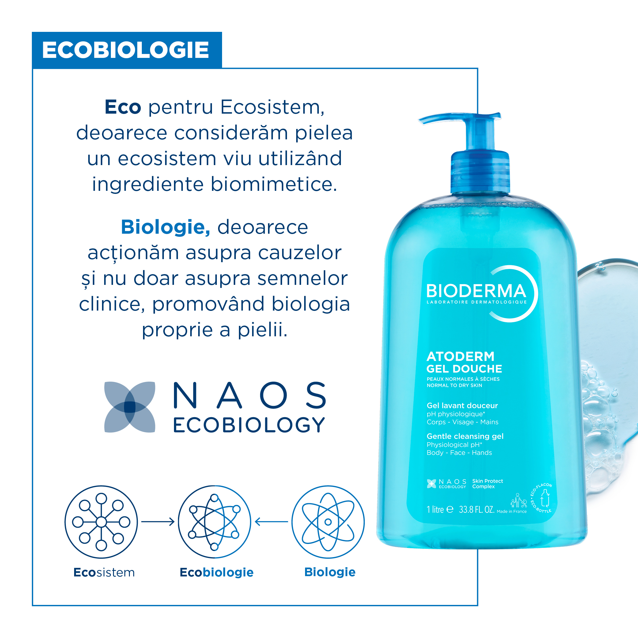 Gel de duş Bioderma Atoderm 1 L este un produs dermatologic conceput pentru igiena zilnică a pielii normale, uscate, sensibile sau predispuse la dermatită atopică. Formulat cu Skin Protect™ şi D.A.F.™, curăţă delicat faţa, corpul şi mâinile, hidratează intens şi întăreşte bariera cutanată, reducând senzaţia de piele care „ţine”. Este potrivit pentru adulţi, copii şi bebeluşi, inclusiv pielea delicată a bebeluşilor, şi respectă pH‑ul fiziologic al pielii.
