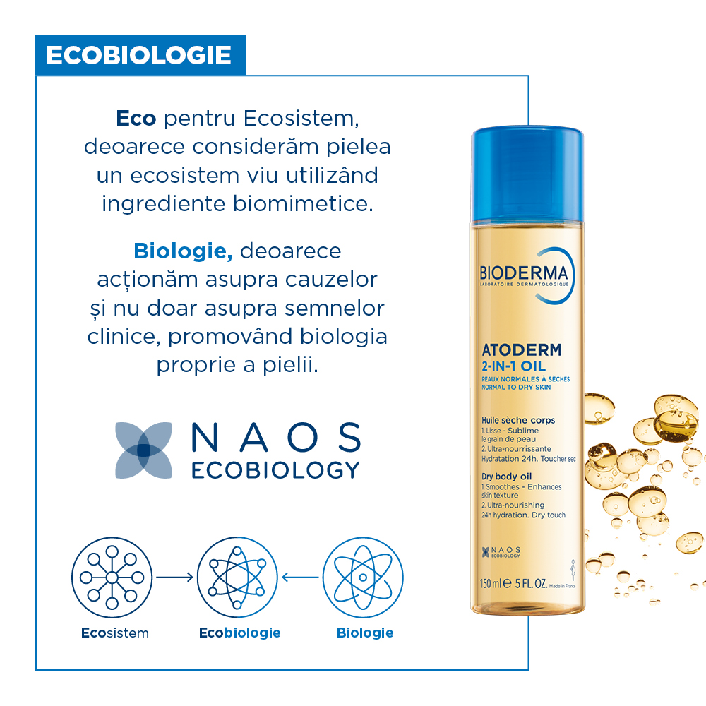 Atoderm Ulei 2-in-1 este un ulei uscat dezvoltat pentru a asigura eficacitatea pe doua niveluri: