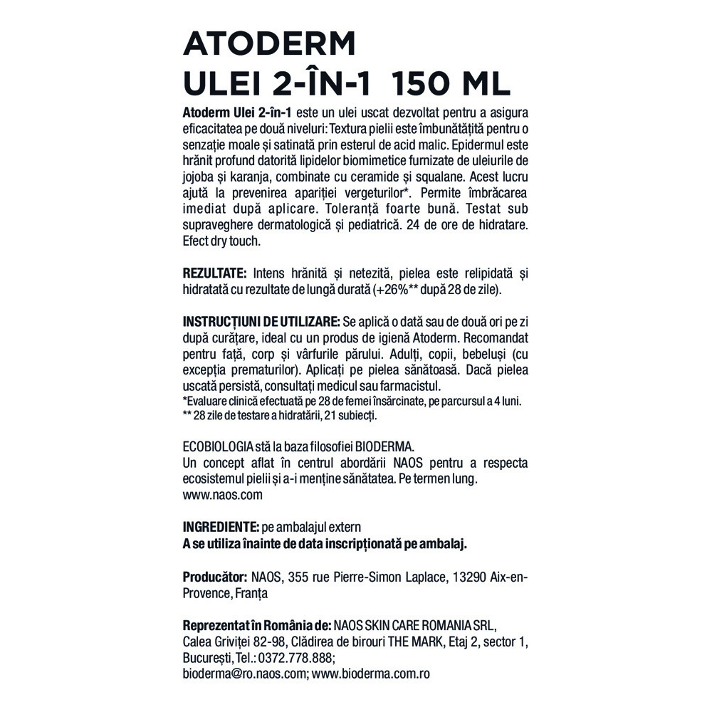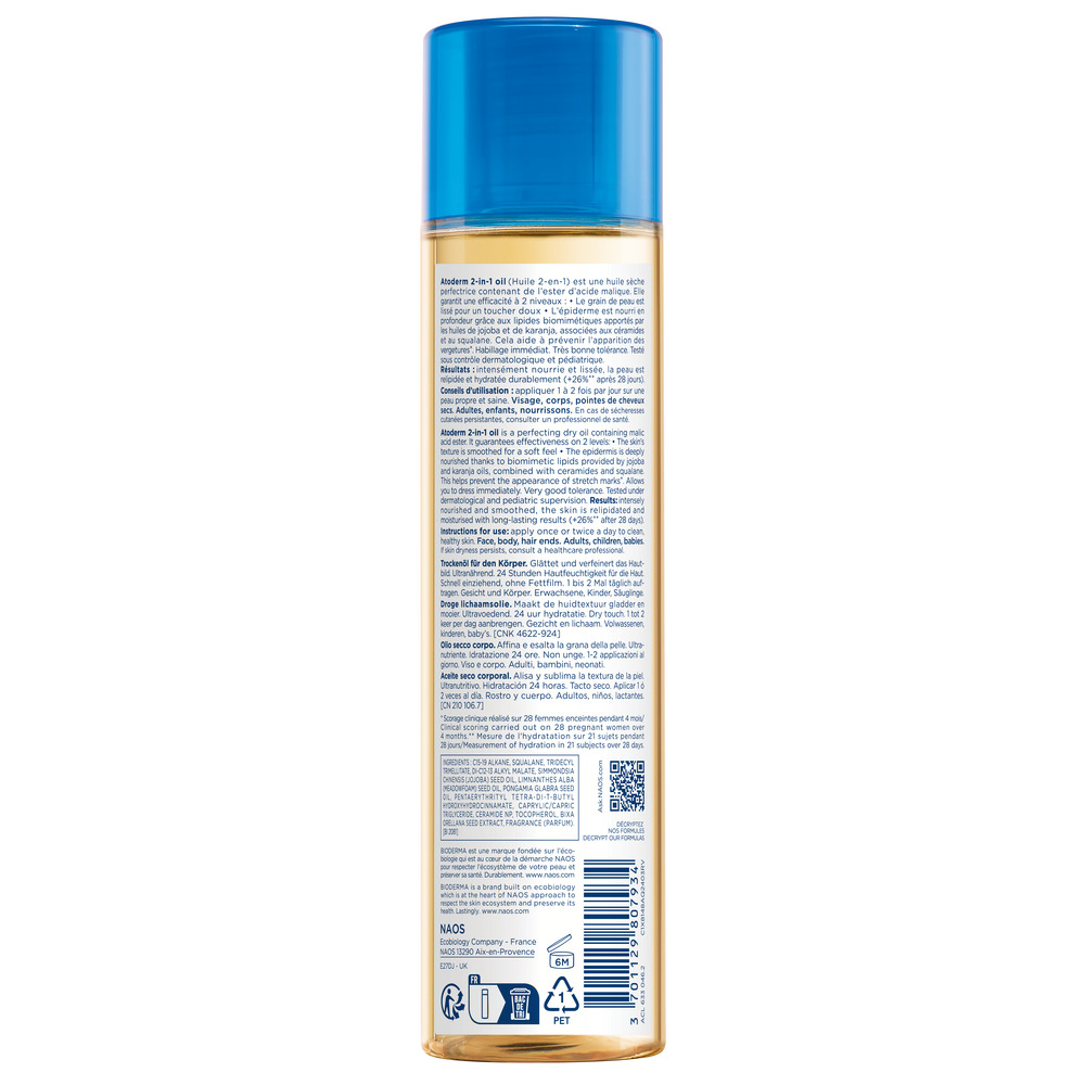 Atoderm Ulei 2-în-1 este un ulei uscat dezvoltat pentru a asigura eficacitatea pe două niveluri: Textura pielii este îmbunătățită pentru o senzație moale și satinată prin esterul de acid malic;