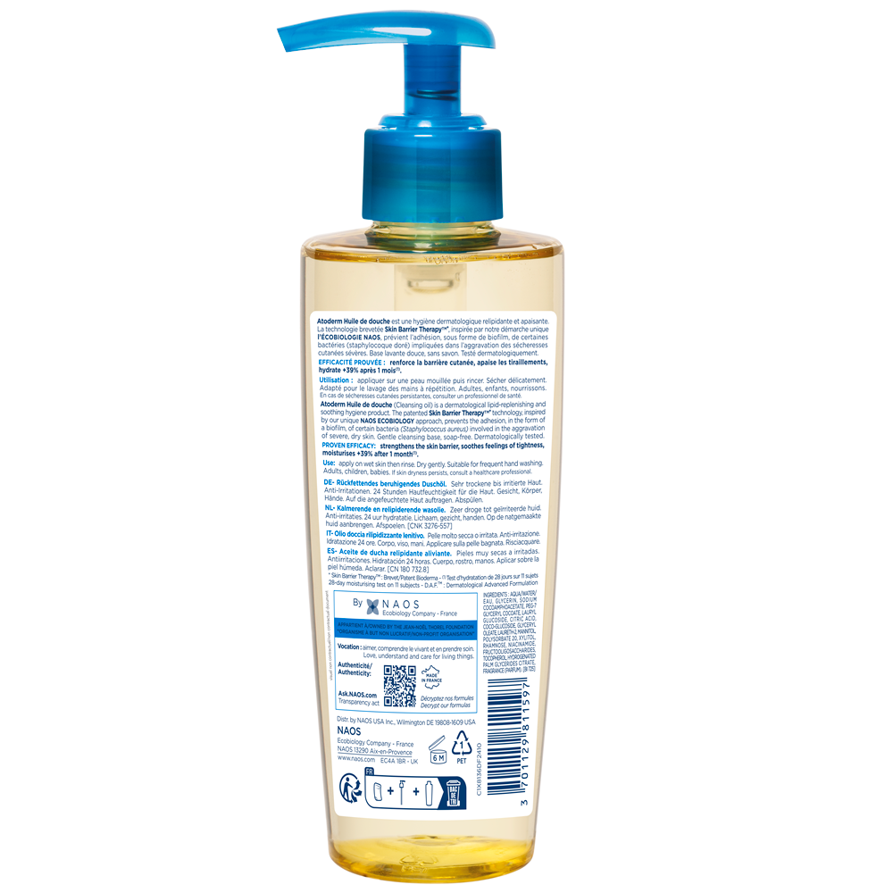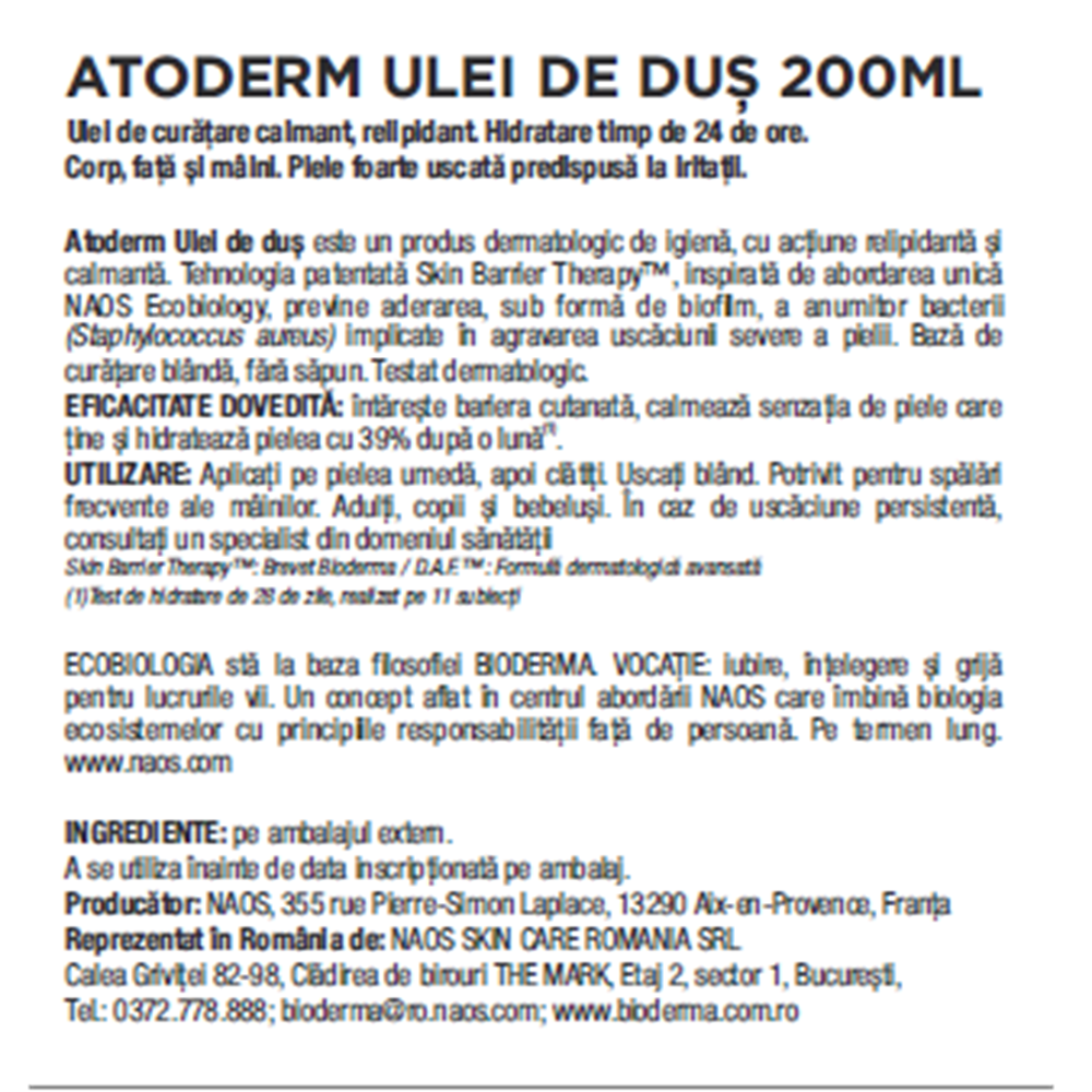 Atoderm Ulei de duş este un produs dermatologic de igienă, cu acțiune relipidantă și calmantă. Tehnologia patentată Skin Barder Therapy™, Inspirată de abordarea unică NAOS Ecobiology, previne aderarea, sub formă de biofilm, a anumitor bacterii (Staphylococcus aureus) implicate in agravarea uscăciuni severe a pielii. Bază de curățare blândă, fără săpun. Testat dermatologic.