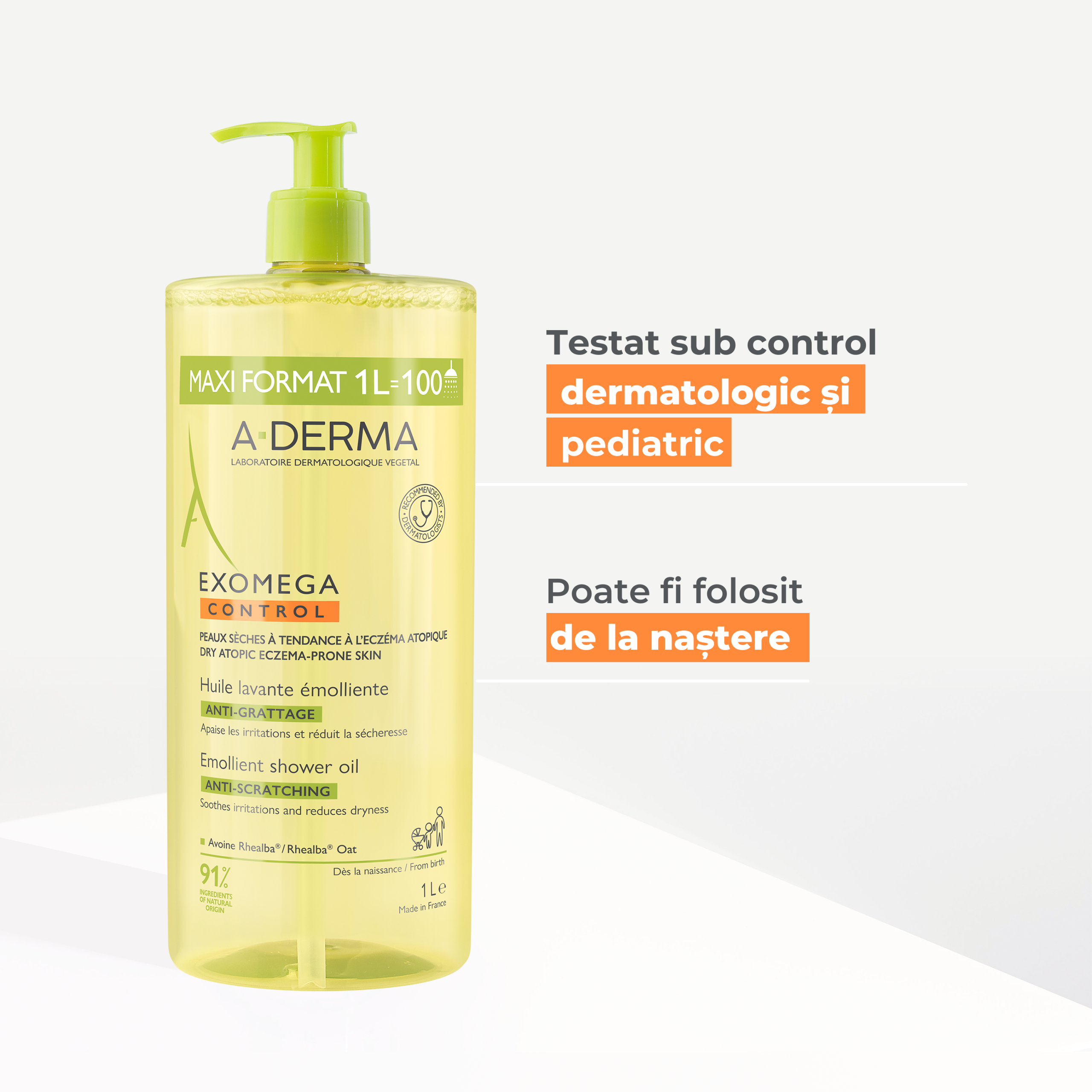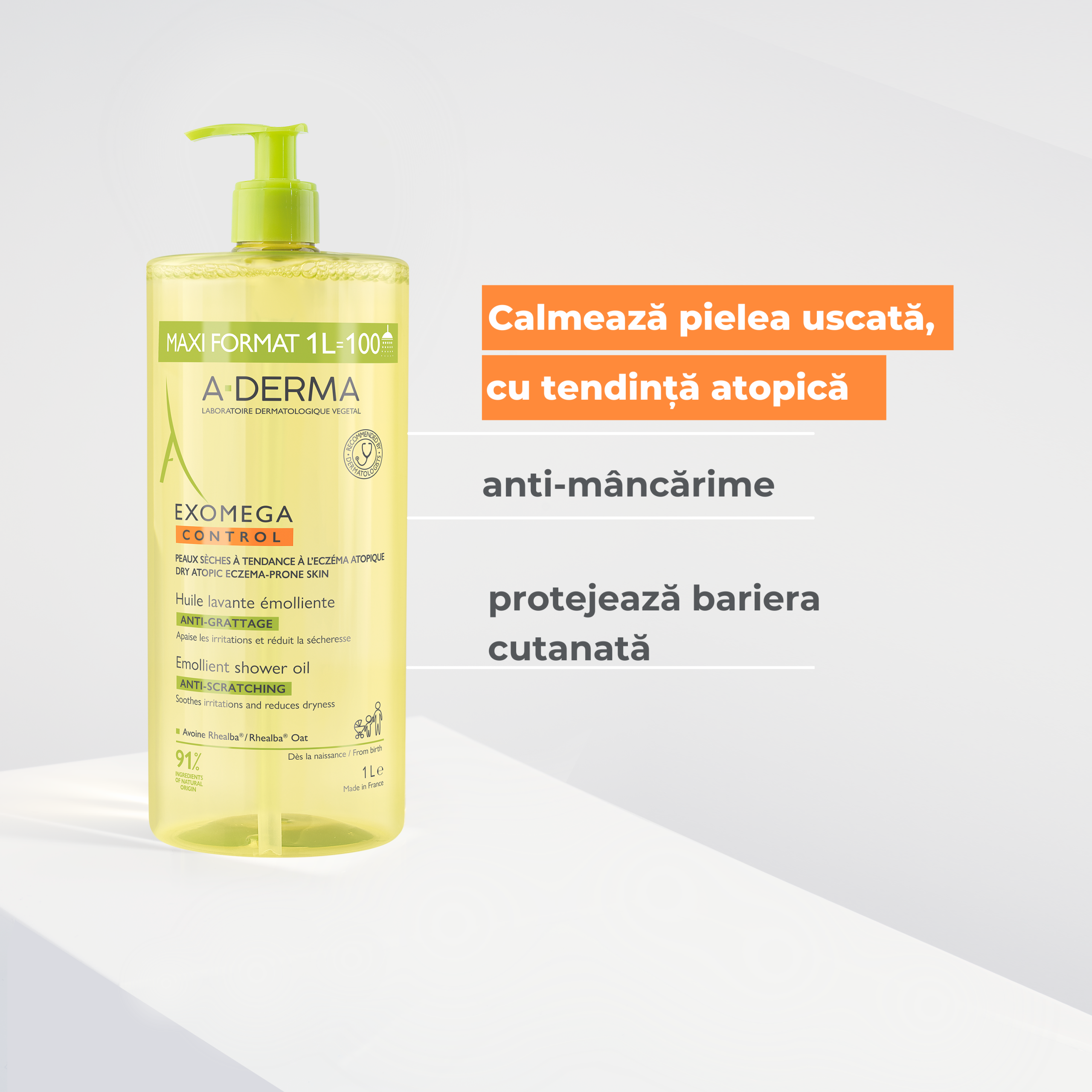 Exomega Control Ulei de dus emolient A-Derma 1L este un gel de curatare delicat, special formulat pentru pielea uscata, foarte uscata si cu tendinta atopica. Conceput pentru utilizare zilnica de catre intreaga familie, acest ulei de dus curata eficient fara sa agreseze bariera cutanata, calmeaza senzatia de disconfort si ajuta la reducerea uscaciunii pielii. Formula sa emolienta, fara sapun, este ideala pentru pielea sensibila, reactiva si predispusa la iritatii, oferind confort imediat inca din timpul dusului sau baii. Formatul MAXI de 1L este potrivit pentru utilizare frecventa si pe termen lung.