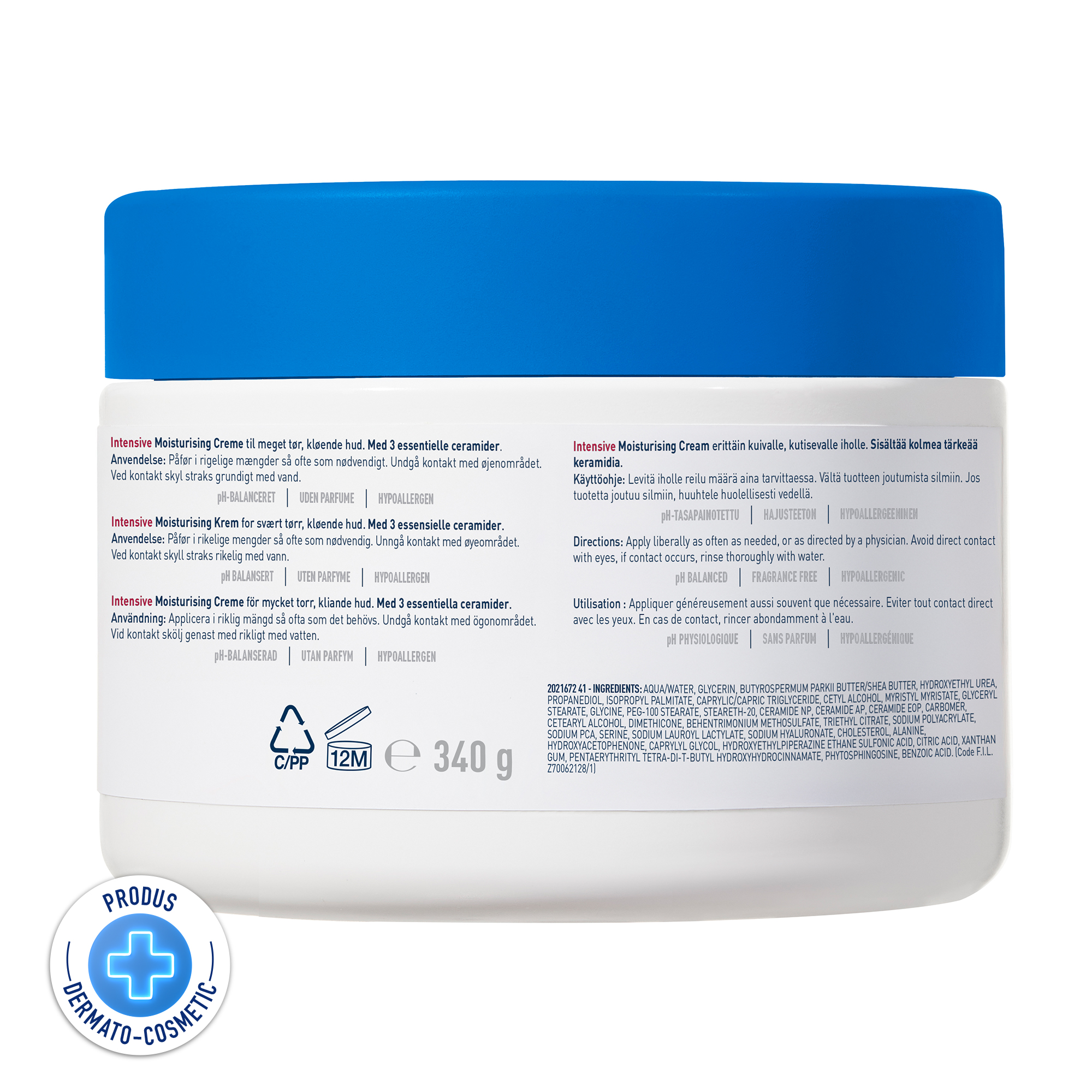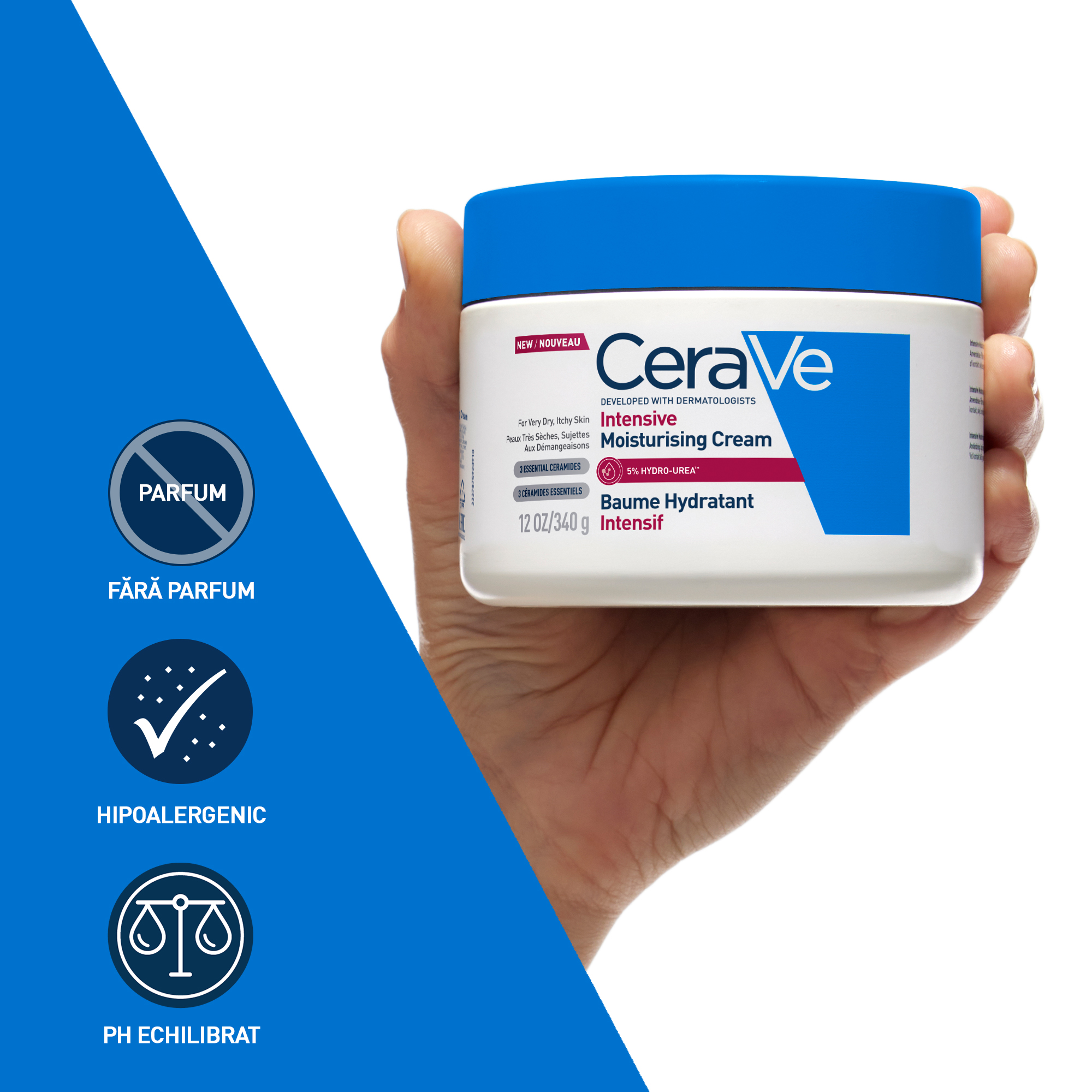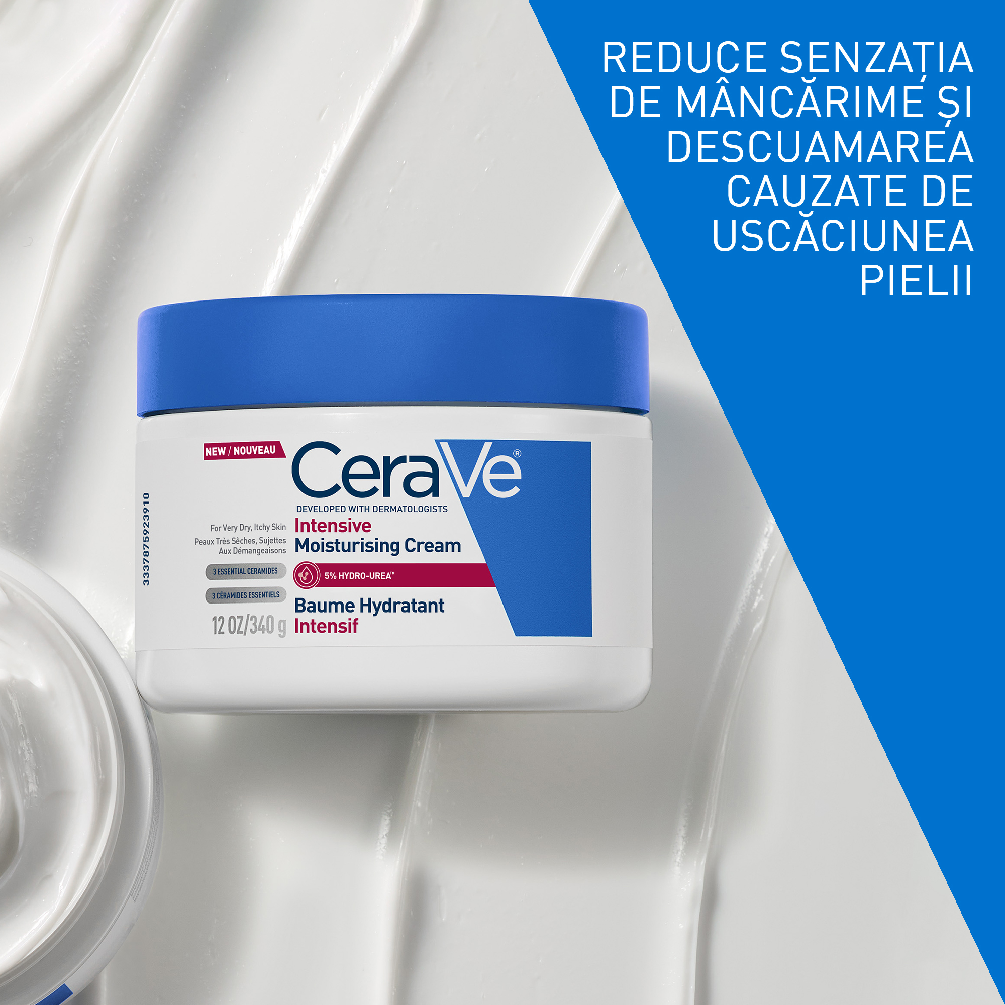 Dezvoltată împreună cu medicii dermatologi, Crema Intens Hidratantă CeraVe este cea mai hidratantă formulă CeraVe, ideală pentru pielea foarte uscată, cu senzație de mâncărime cauzată de uscăciunea pielii.