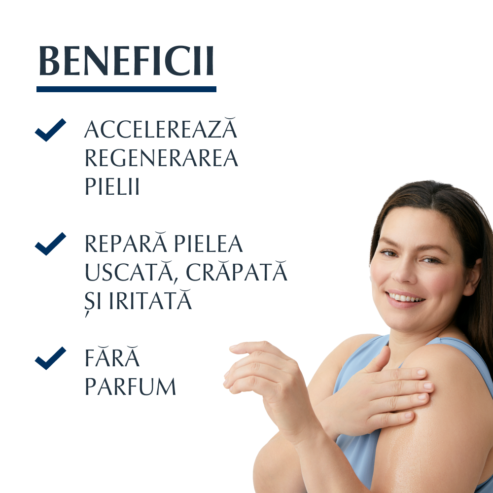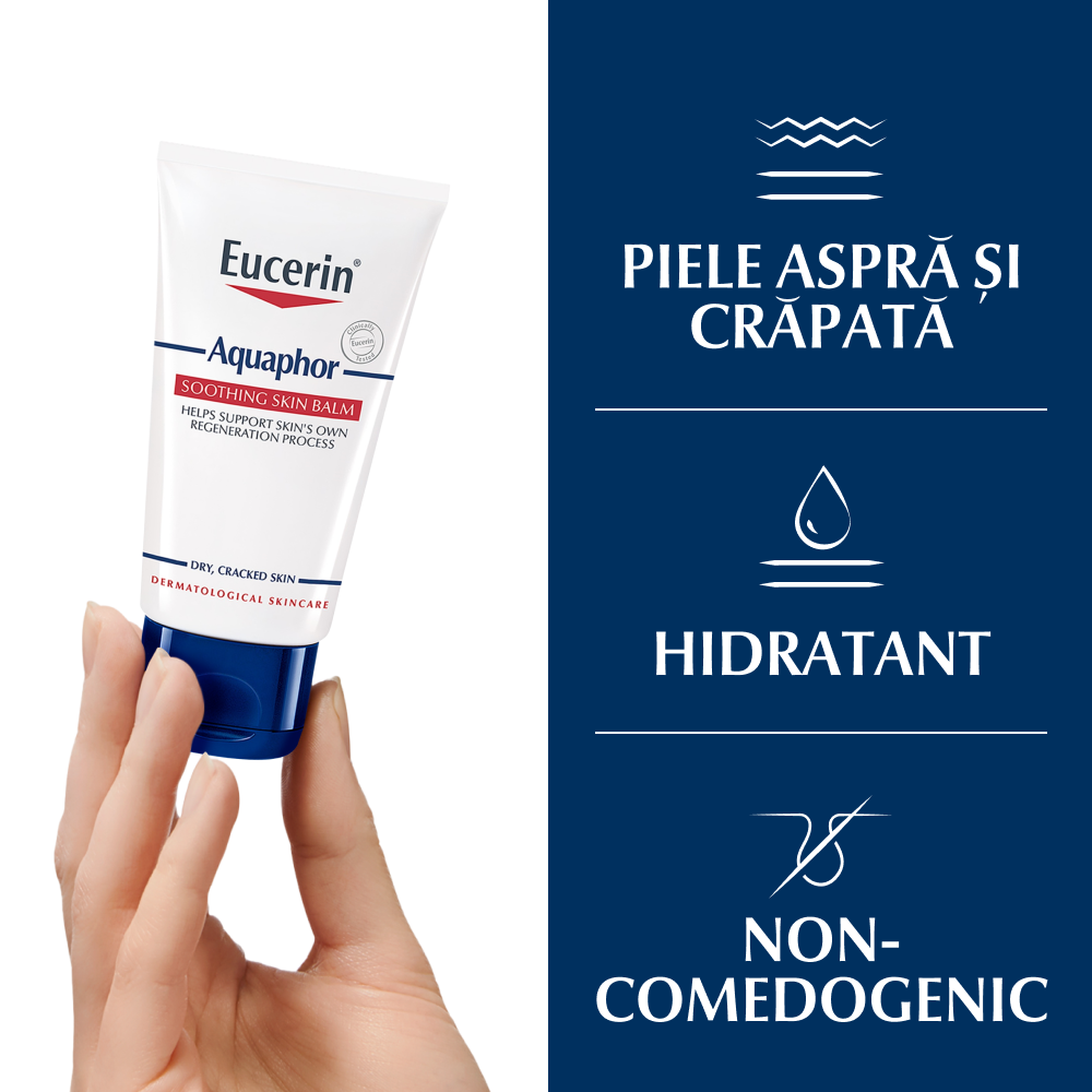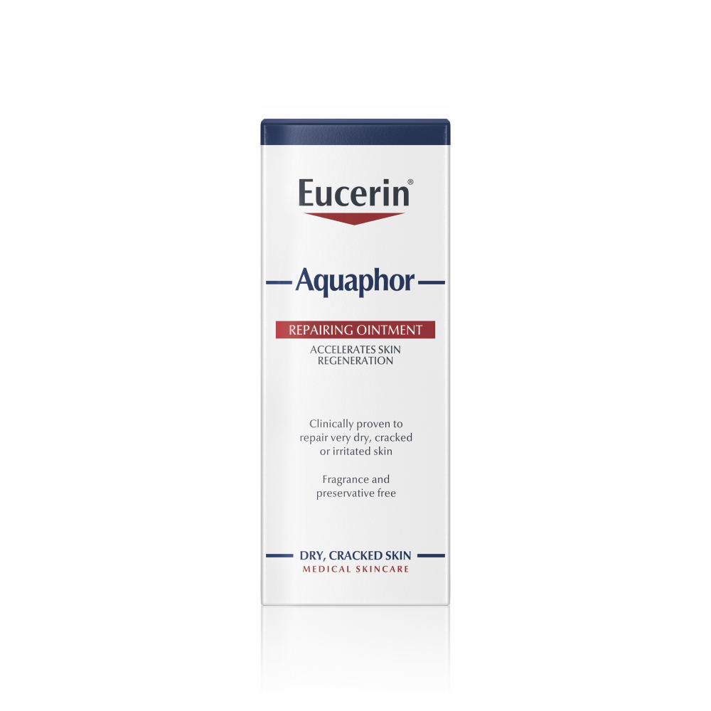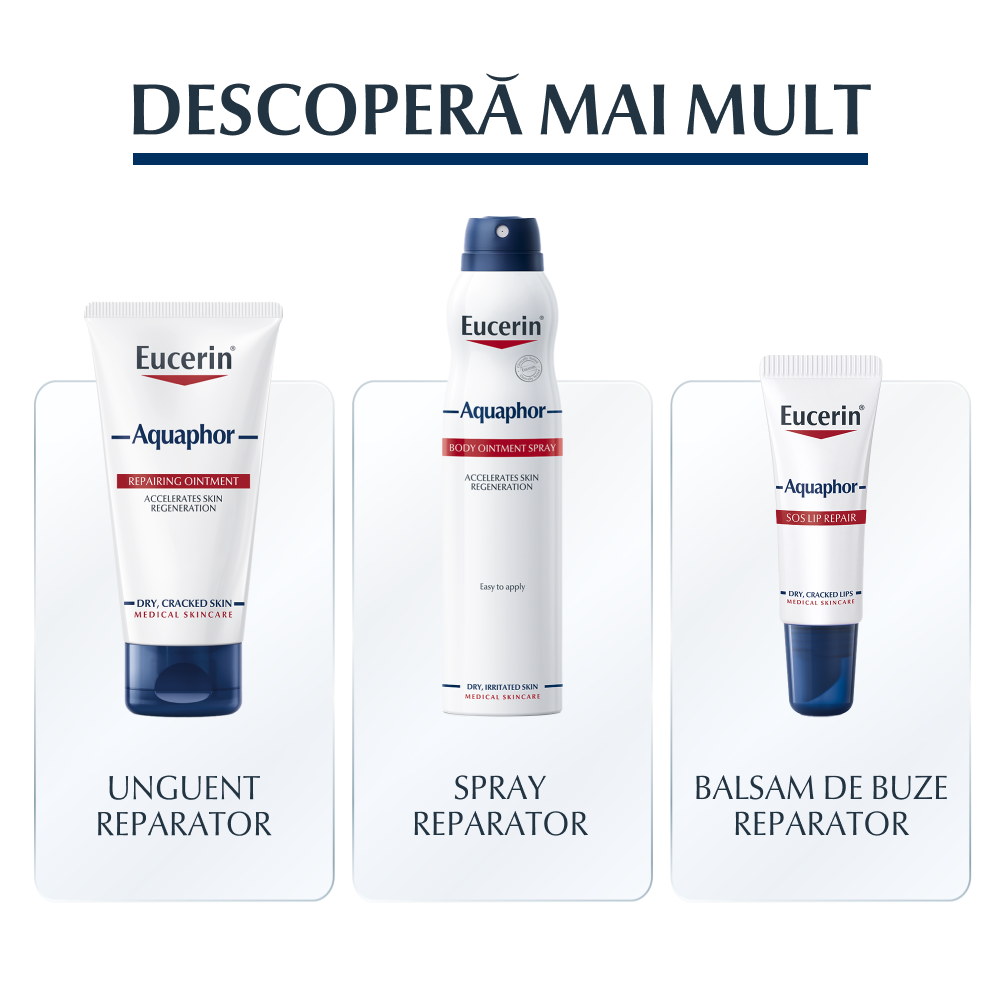 Eucerin® Aquaphor unguent reparator – formulă fără parfum sau conservanți, recomandată pentru pielea foarte uscată, crăpată, iritată sau supusă stresului superficial. Potrivit pentru corp, față și bebeluși.