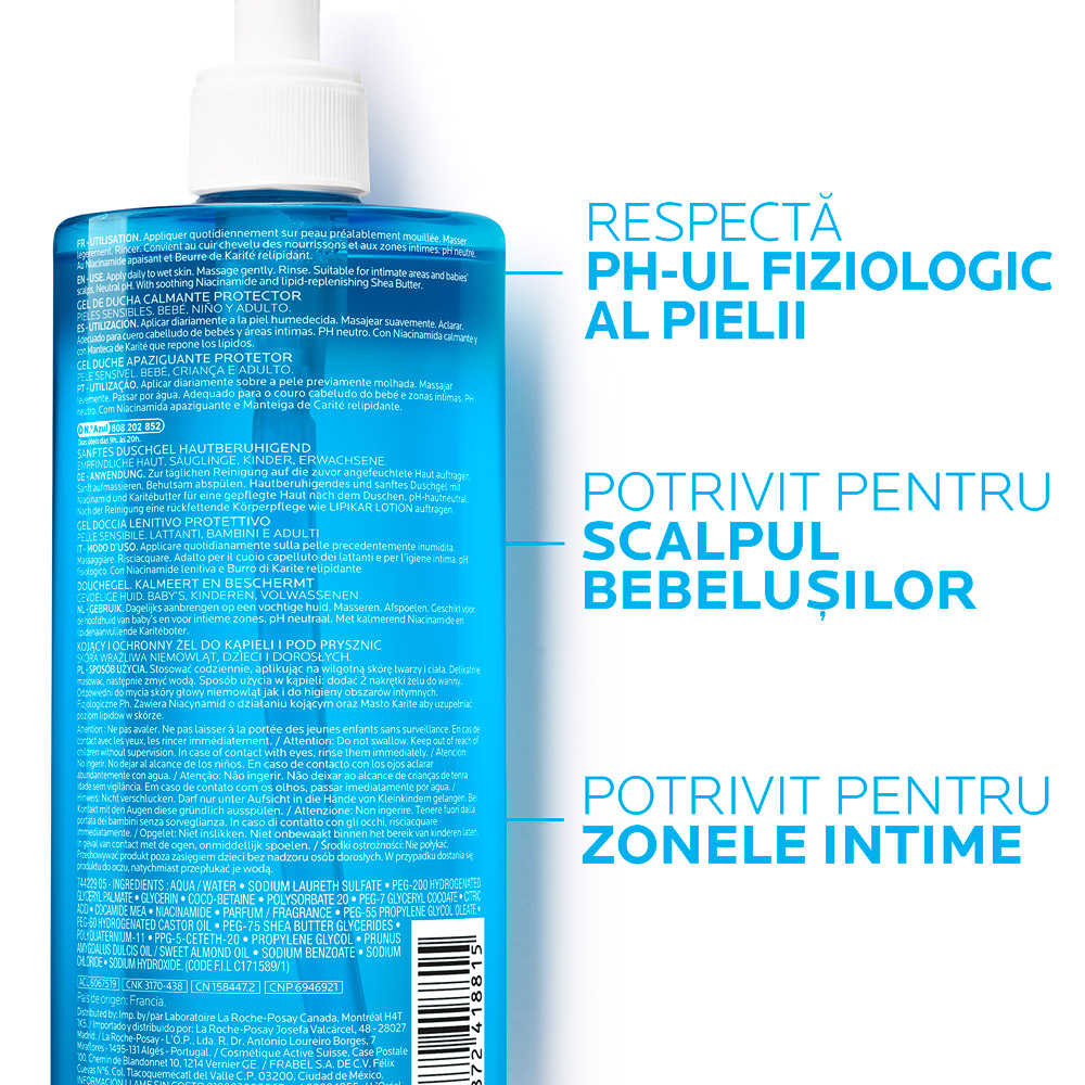 Formulat cu niacinamidă calmantă și unt de shea relipidant, gelul de spălare curăță delicat, protejează bariera cutanată și reduce disconfortul, respectând pH-ul fiziologic al pielii. Este potrivit pentru întreaga familie, inclusiv bebeluși și copii. Nu provoacă usturime ochilor.