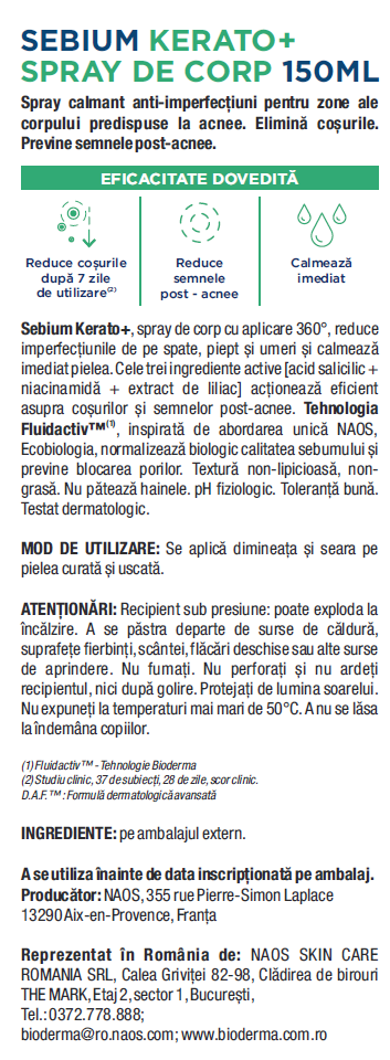 Sebium Kerato+ Spray reduce imperfecțiunile, petele post-acneice și roșeața, reglează sebumul și oferă toleranță ridicată pielii.