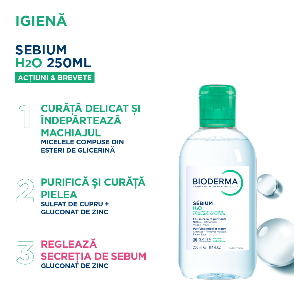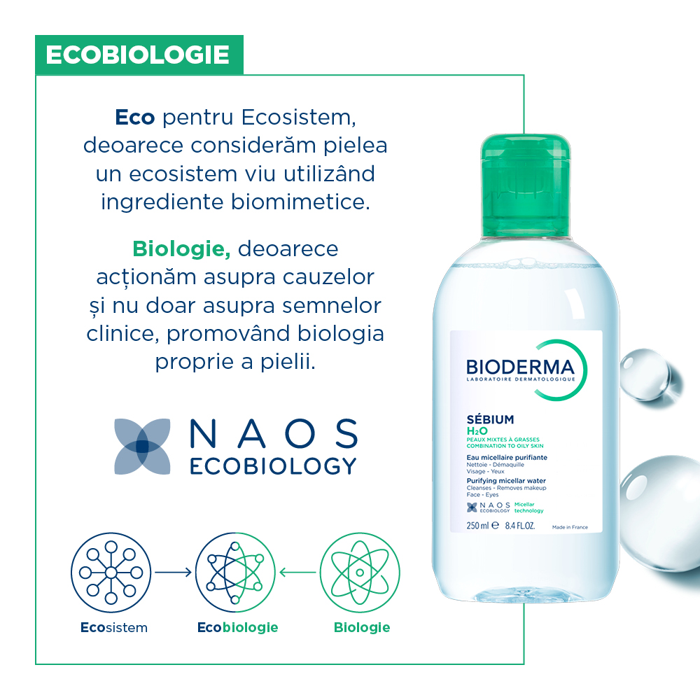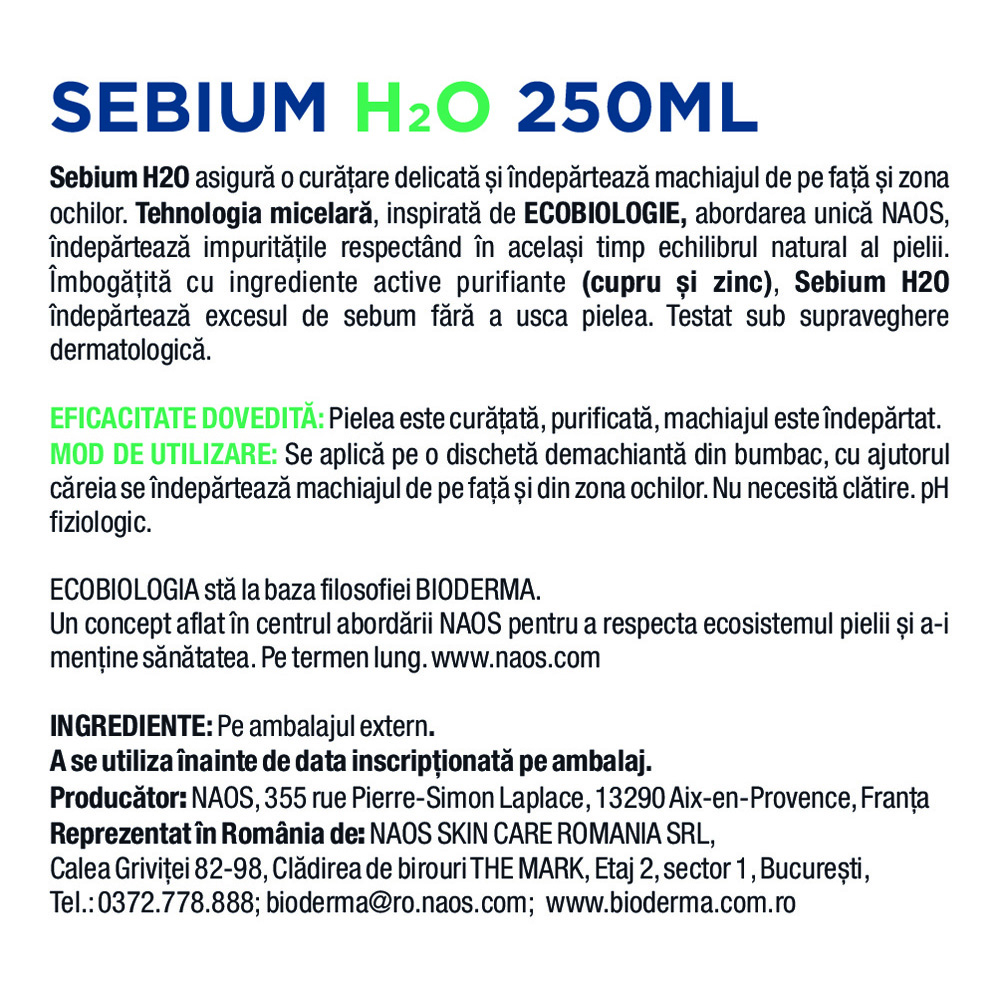 Sebium H2O asigura o curatare delicata si indeparteaza machiajul de pe fata si zona ochilor. Tehnologia micelara, inspirata de ECOBIOLOGIE, abordarea unica NAOS, indeparteaza impuritatile respectand in acelasi timp echilibrul natural al pielii. Imbogatita cu ingrediente active purifiante (cupru si zinc), Sebium H2O indeparteaza excesul de sebum fara a usca pielea.