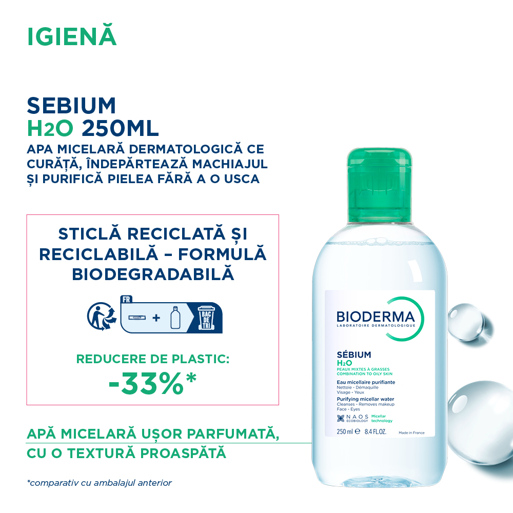 Descopera Bioderma Sebium H2O - apa micelara purifianta pentru ten mixt si gras. Curata delicat, indeparteaza machiajul si limite secretia de sebum.