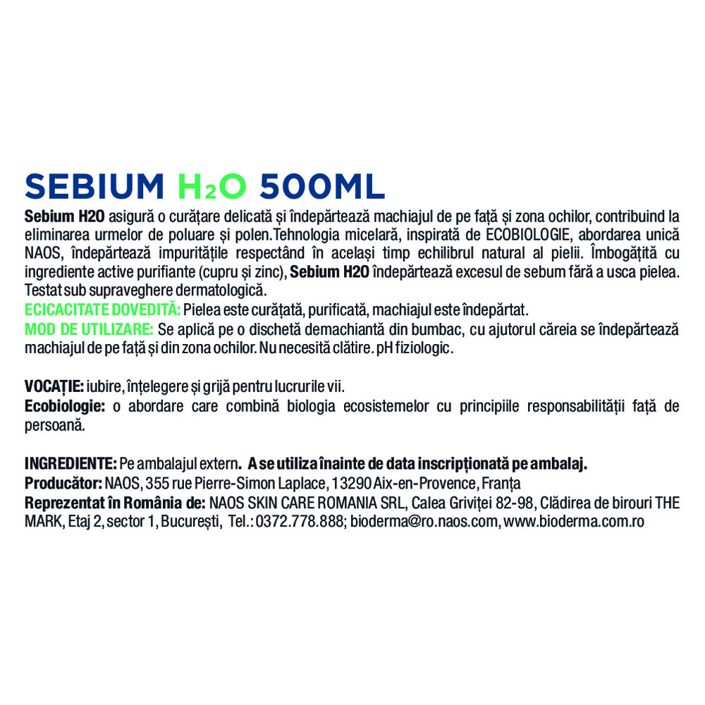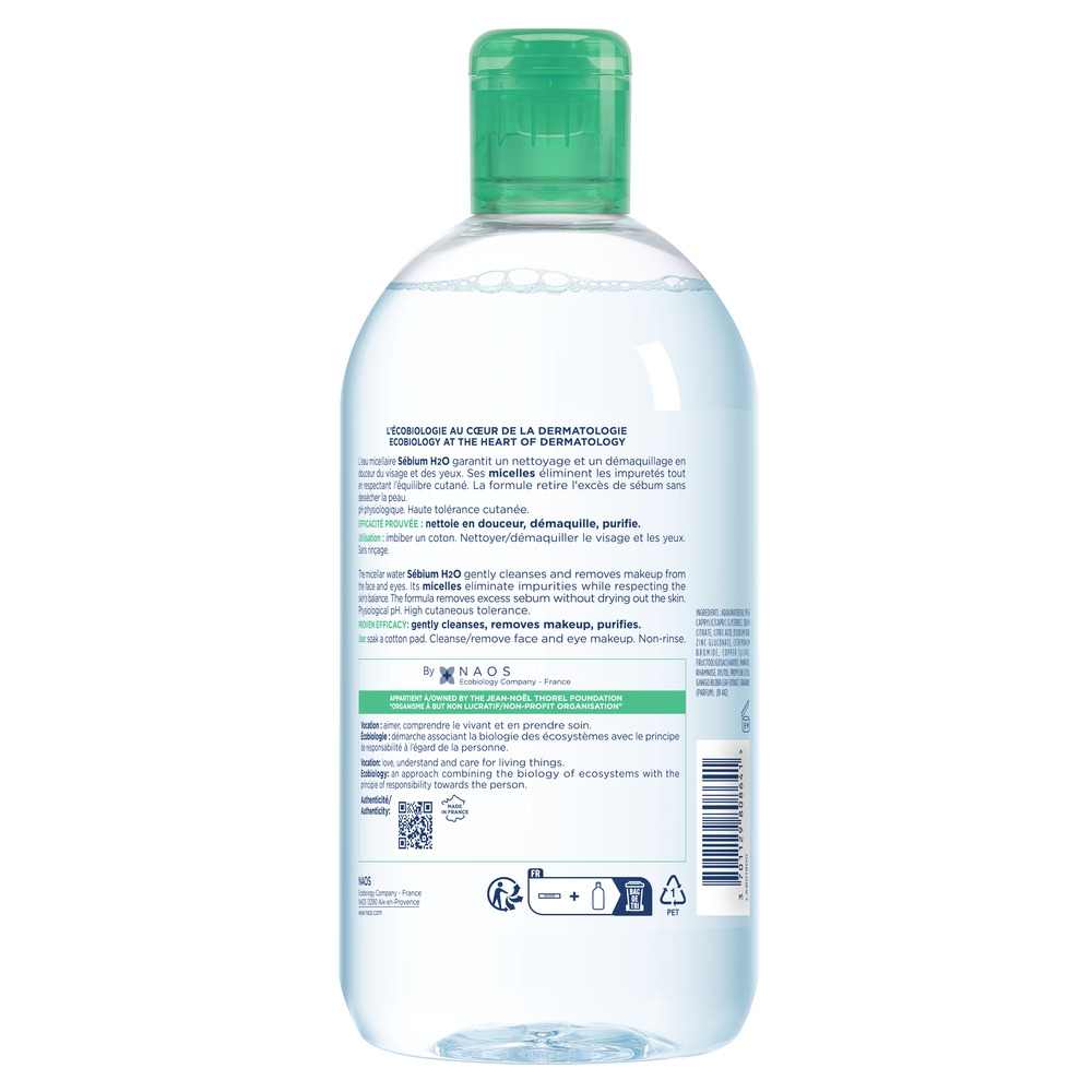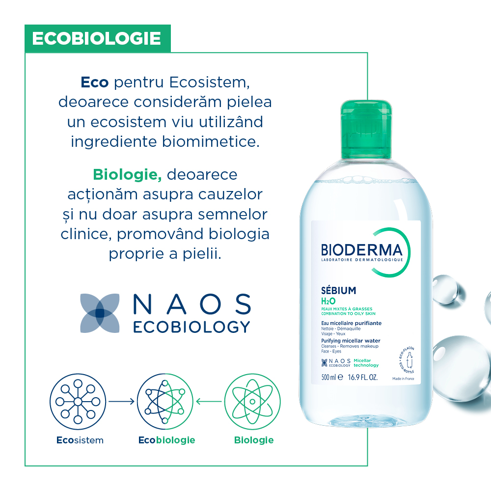 Sebium H2O asigura o curatare delicata si indeparteaza machiajul de pe fata si zona ochilor. Tehnologia micelara, inspirata de ECOBIOLOGIE, abordarea unica NAOS, indeparteaza impuritatile respectand in acelasi timp echilibrul natural al pielii. Imbogatita cu ingrediente active purifiante (cupru si zinc), Sebium H2O indeparteaza excesul de sebum fara a usca pielea.