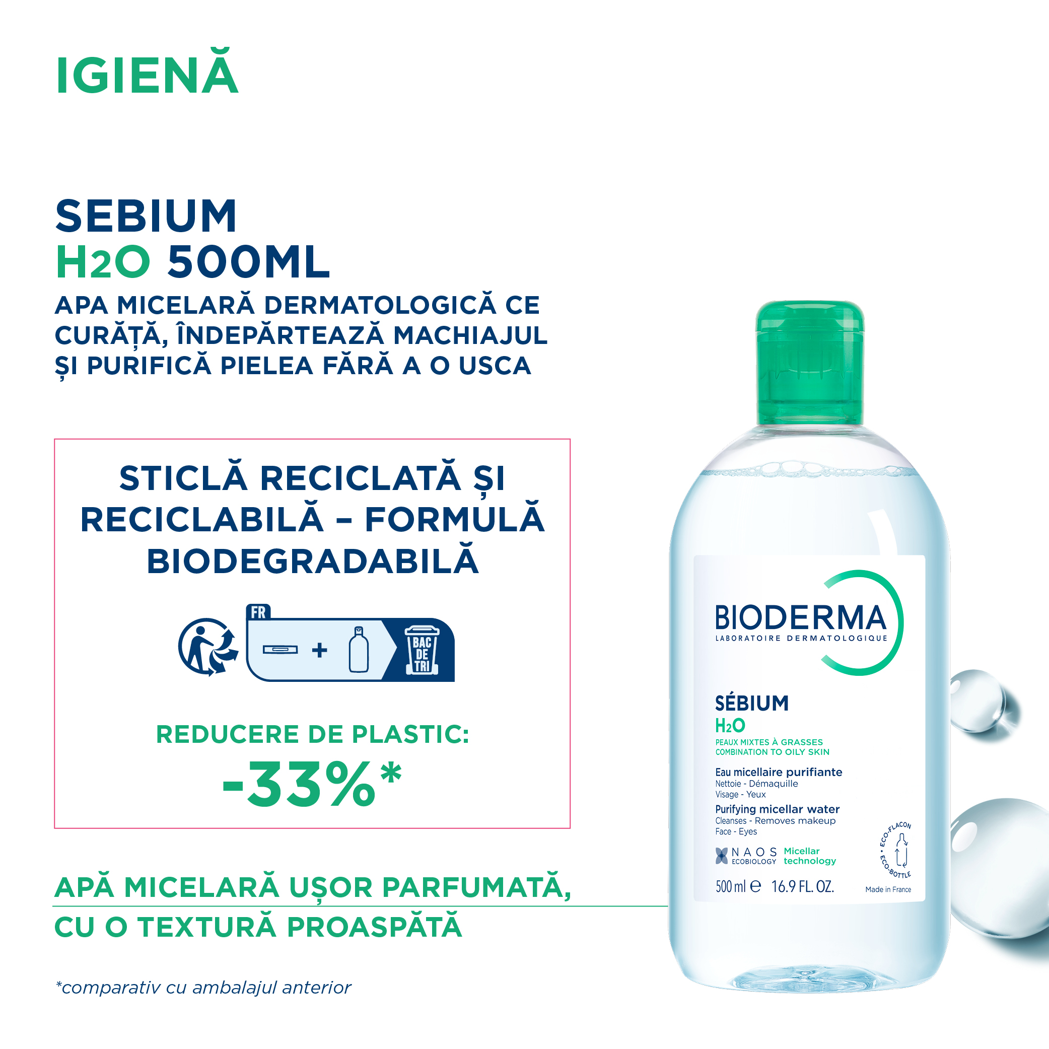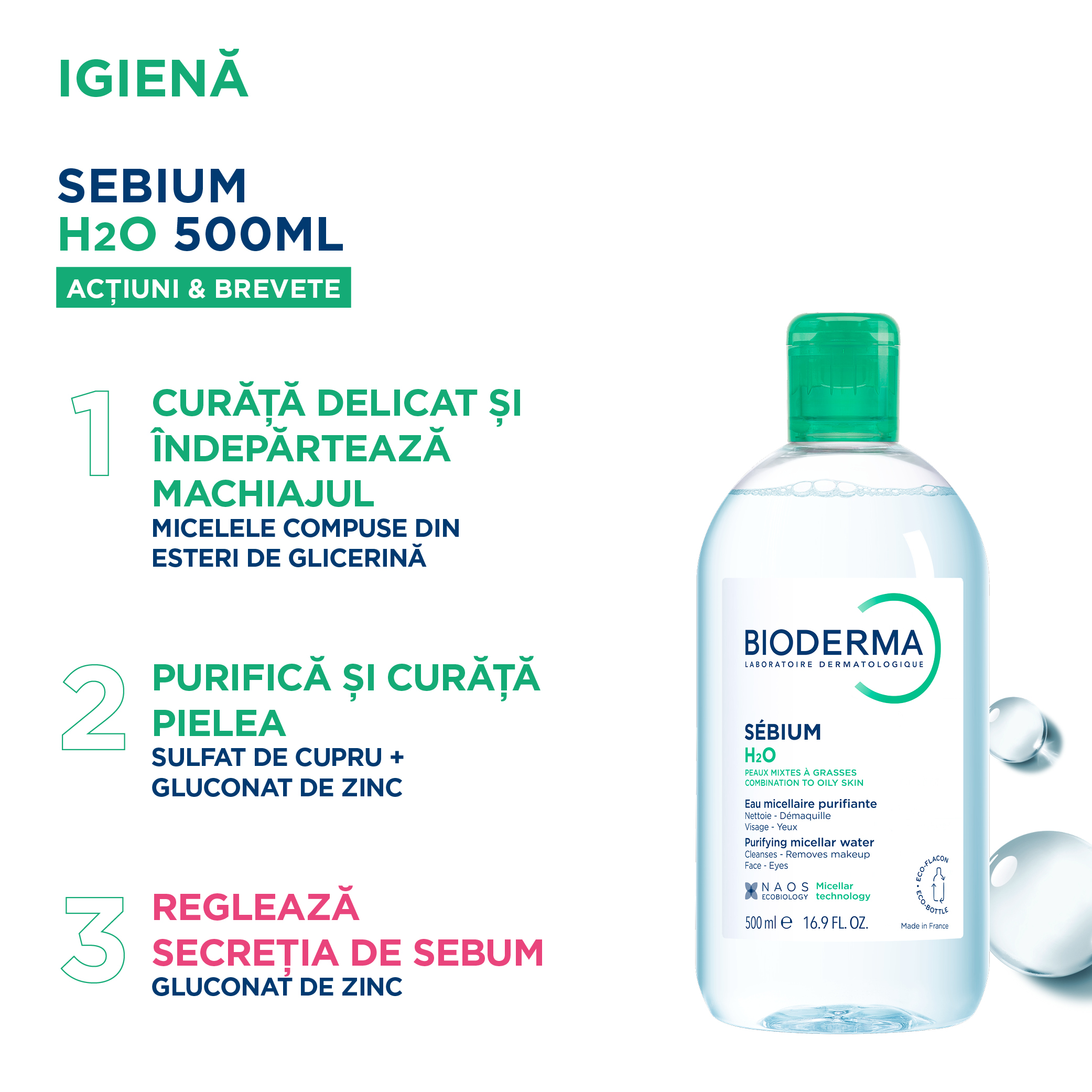 Descopera Bioderma Sebium H2O - apa micelara purifianta pentru ten mixt si gras. Curata delicat, indeparteaza machiajul si limite secretia de sebum.