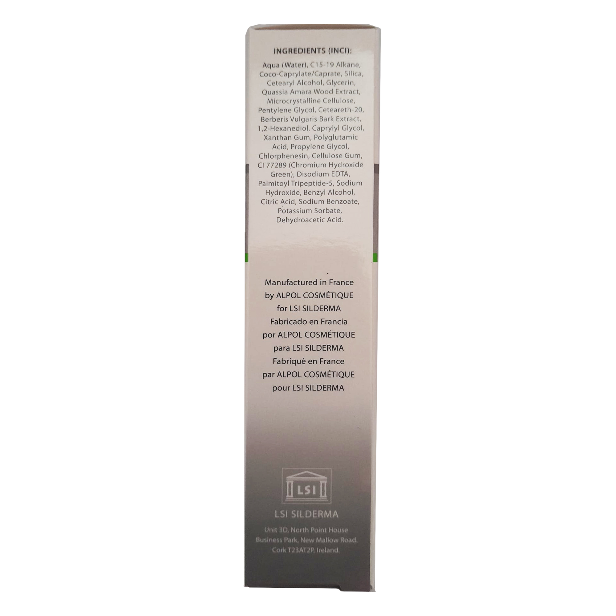 Aqua (Water), C15-19 Alkane, Coco-Caprylate/Caprate, Silica, Cetearyl Alcohol, Glycerin, Quassia Amara Wood Extract, Microcrystalline Cellulose, Pentylene Glycol, Ceteareth-20, Berberis Vulgaris Bark Extract, 1,2-Hexanediol, Caprylyl Glycol, Xanthan Gum, Polyglutamic Acid, Propylene Glycol, Chlorphenesin, Cellulose Gum, CI 77289 (Chromium Hydroxide Green), Disodium EDTA, Palmitoyl Tripeptide-5, Sodium Hydroxide, Benzyl Alcohol, Citric Acid, Sodium Benzoate, Potassium Sorbate, Dehydroacetic Acid