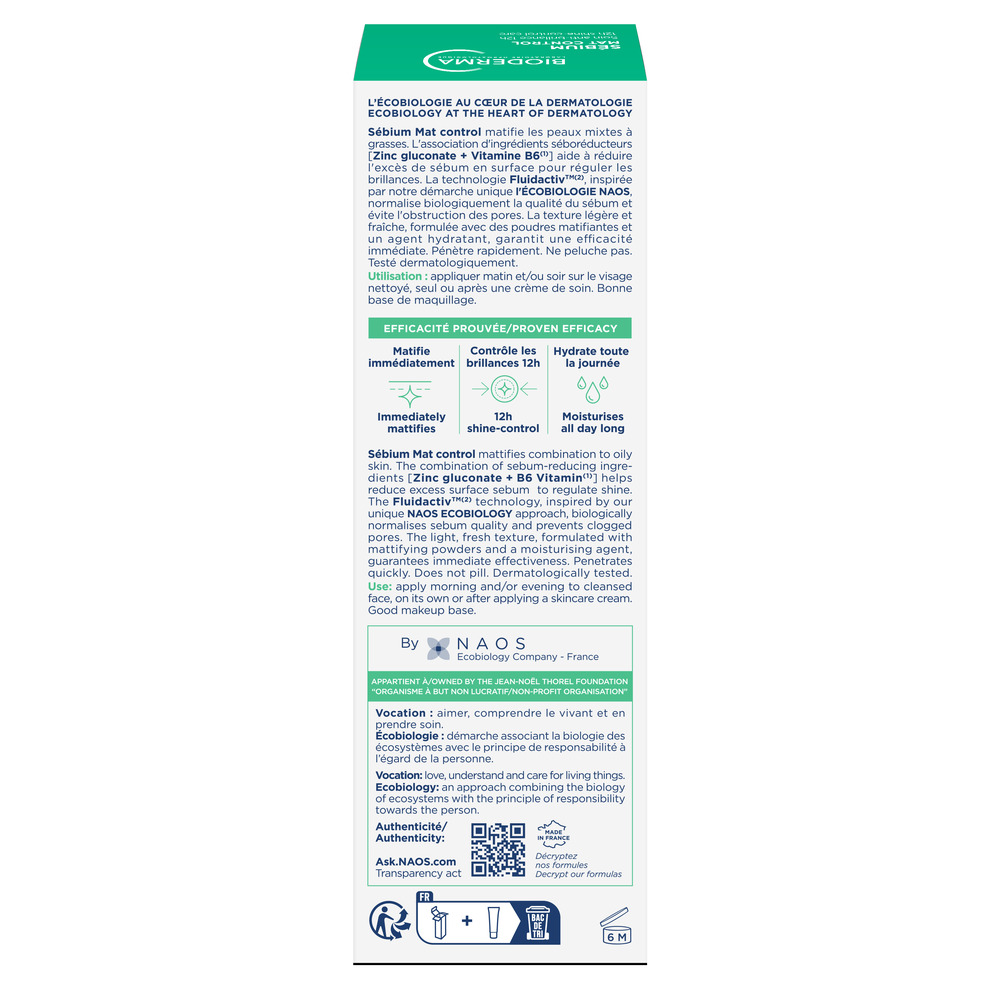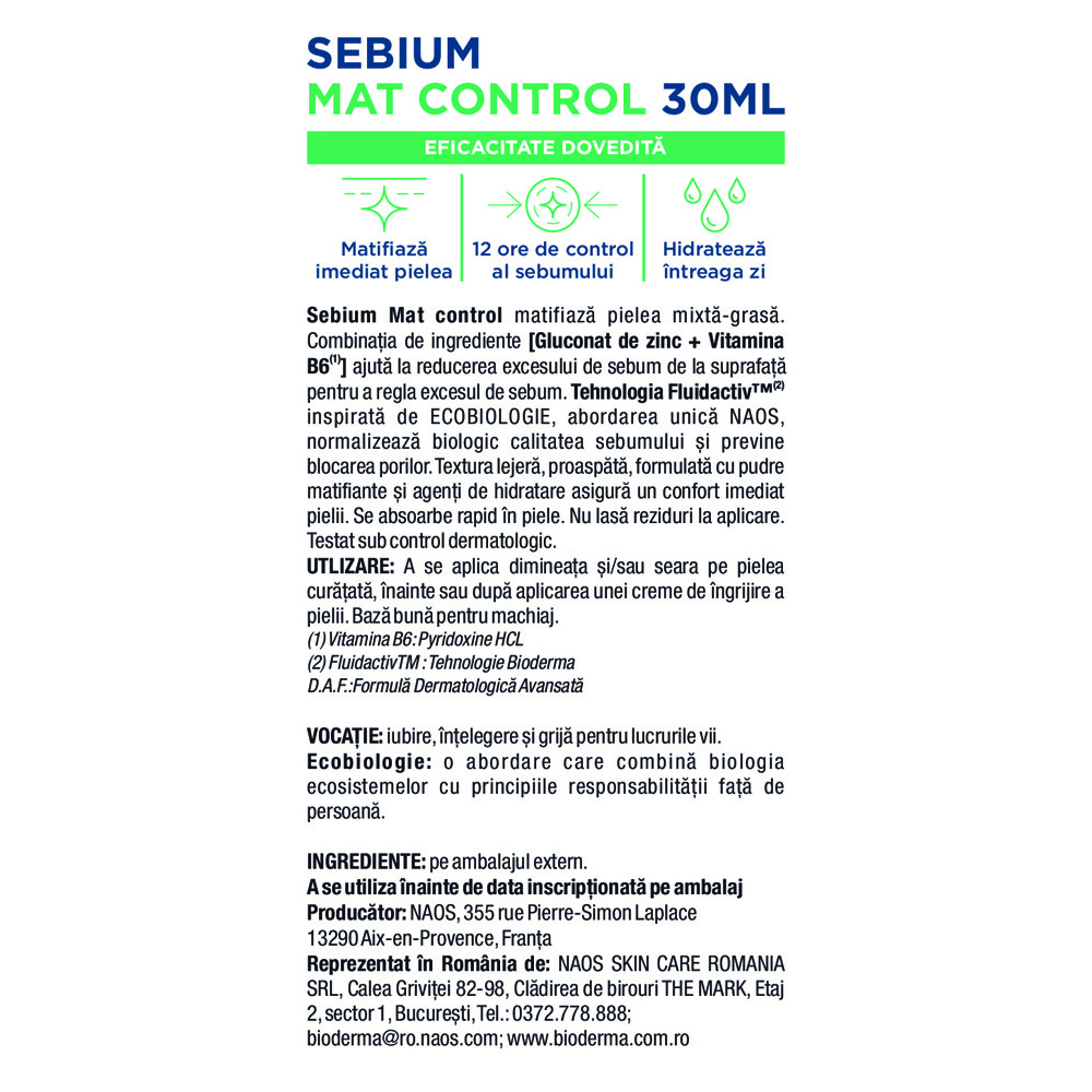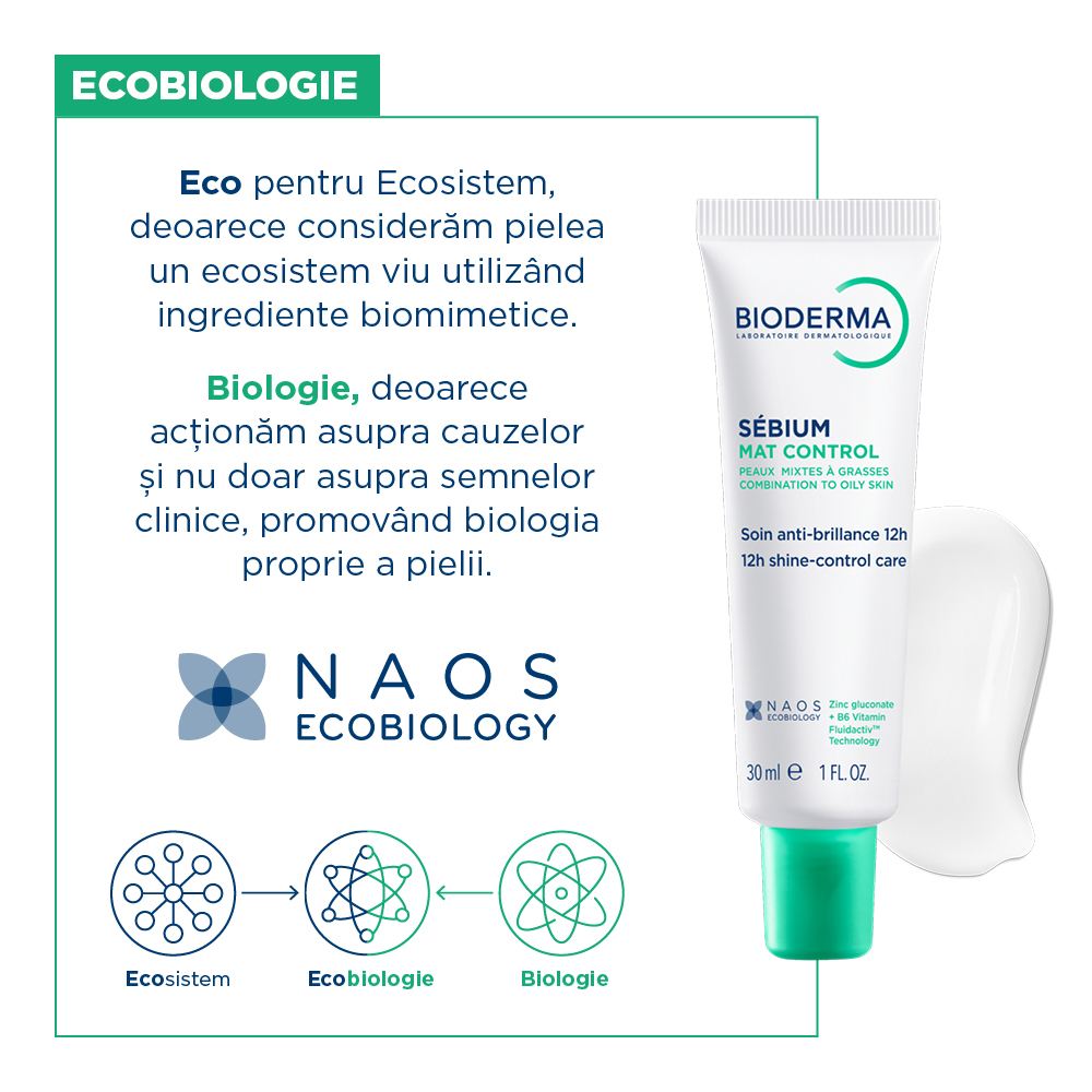 Tehnologia Fluidactiv™ inspirata de ecobiologie, abordarea unica NAOS, contribuie la normalizarea biologica a calitatii sebumului si previne blocarea porilor.