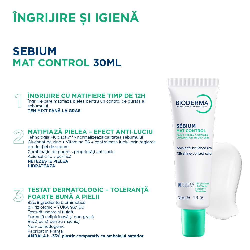 Descopera Bioderma Sebium Mat Control, crema matifianta special conceputa pentru pielea mixta-grasa. Formula cu Gluconat de zinc si Vitamina B6 ajuta la reducerea excesului de sebum si la reglarea secretiei sebacee, pentru un ten mat si echilibrat.