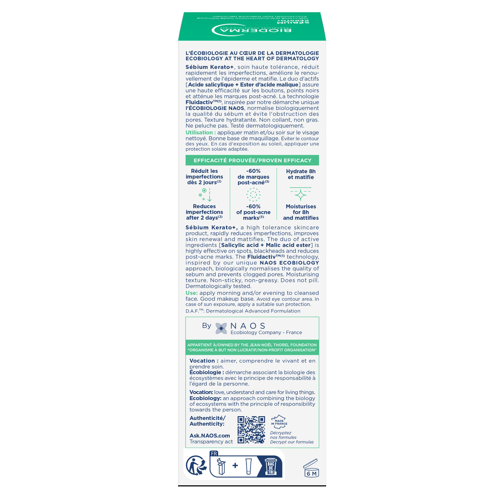 Sebium Kerato+ reduce rapid coşurile şi punctele negre în timp ce îmbunătățește reînnoirea epidermică pentru a preveni riscul apariției cicatricilor post-acneice. Brevetul Fluidactiv TM, normalizează biologic calitatea sebumului şi previne apariția noilor imperfecțiuni. Textură non-grasă şi non-lipicioasă. Pielea este hidratată timp de 8h. Testat sub supraveghere dermatologică.
